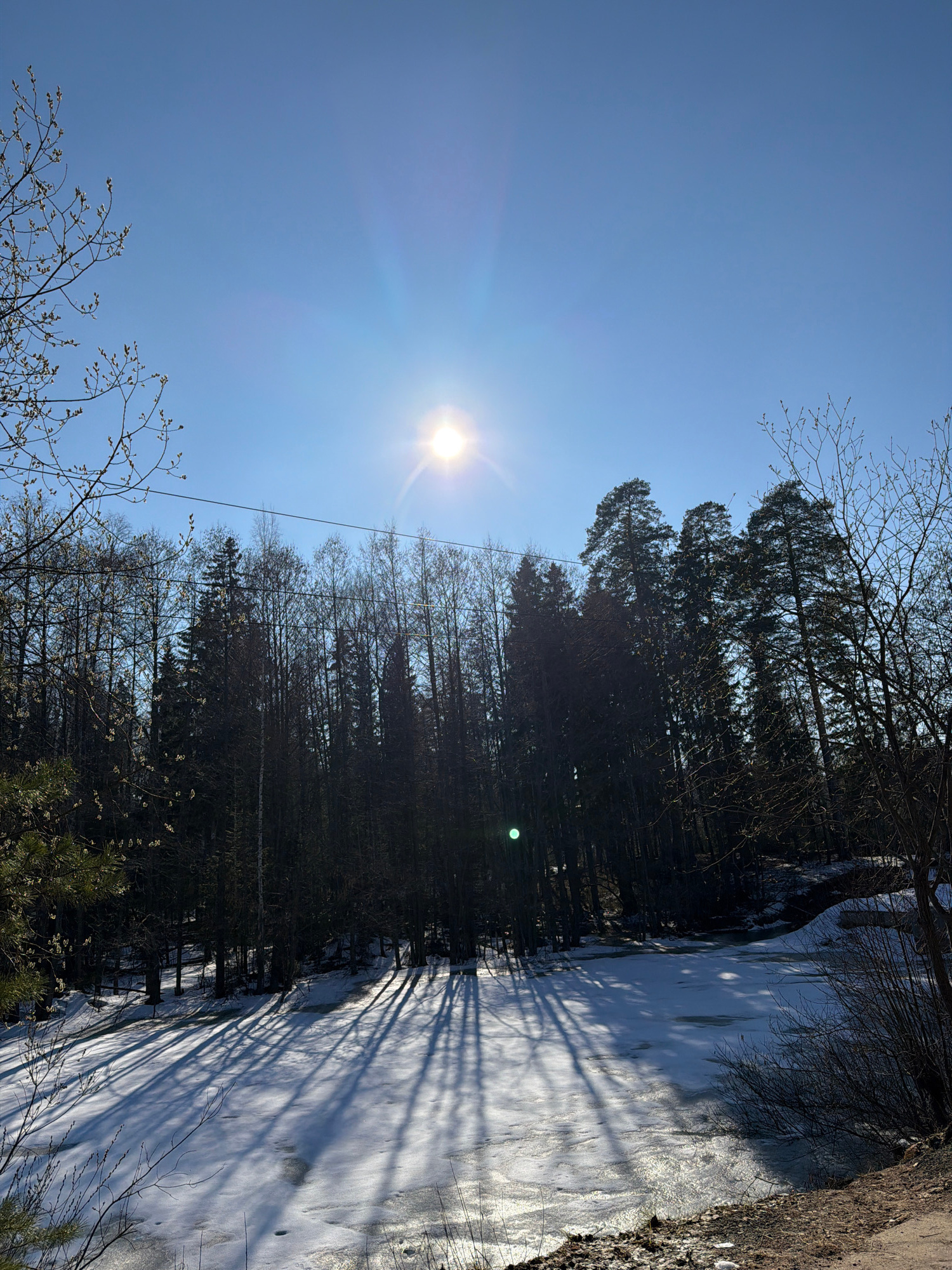 The image shows a winter scene in Chaikovsky, Russia. A body of water, likely a river or lake, is partially frozen and covered with snow. Tall, bare trees line the edge of the water, casting long shad…read more
