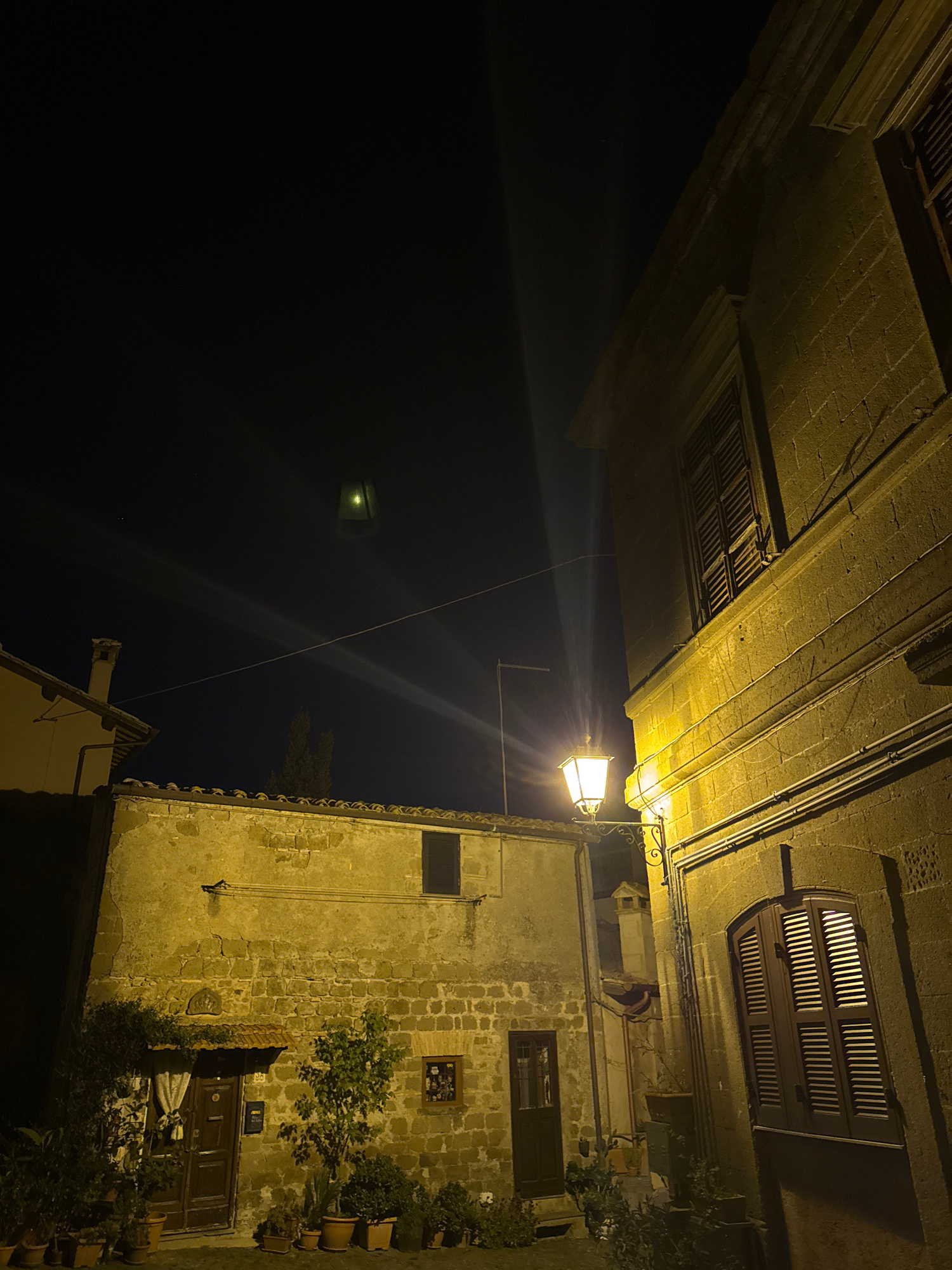 The image, oriented vertically, presents a night scene in Castelnuovo di Porto, Italy. A street lamp, illuminated and emitting beams of light, is affixed to the side of a multi-story stone building. T…read more