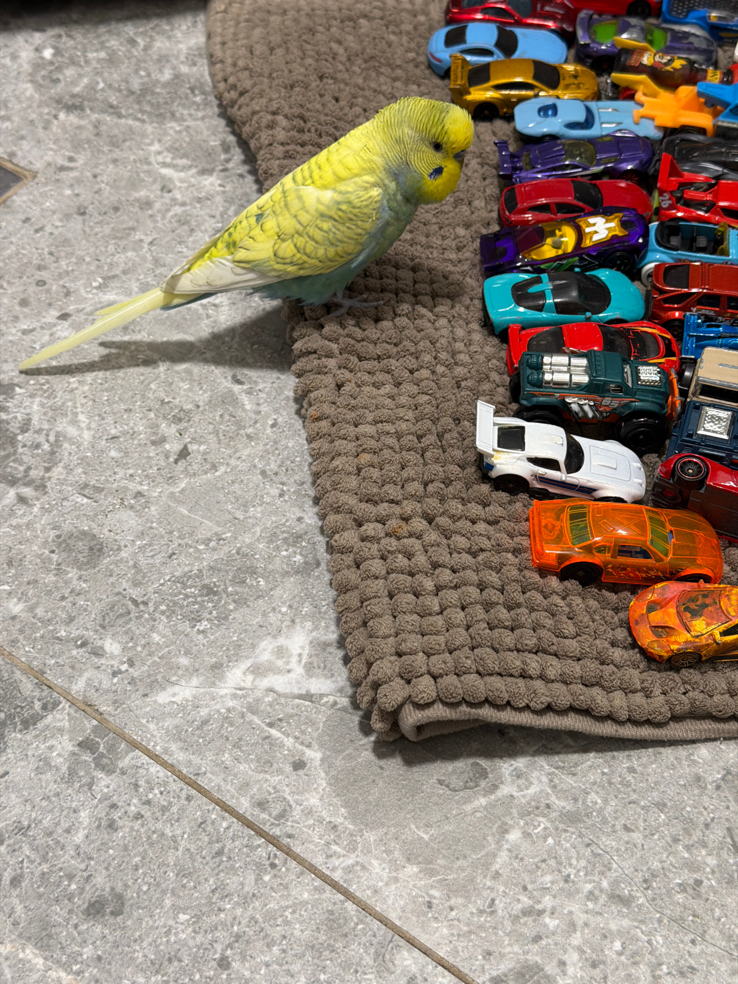 The scene depicts a close-up, overhead view of a collection of toy cars arranged on a brown, textured mat. A yellow and green budgerigar (parakeet) stands to the left of the toy cars, its tail extendi…read more
