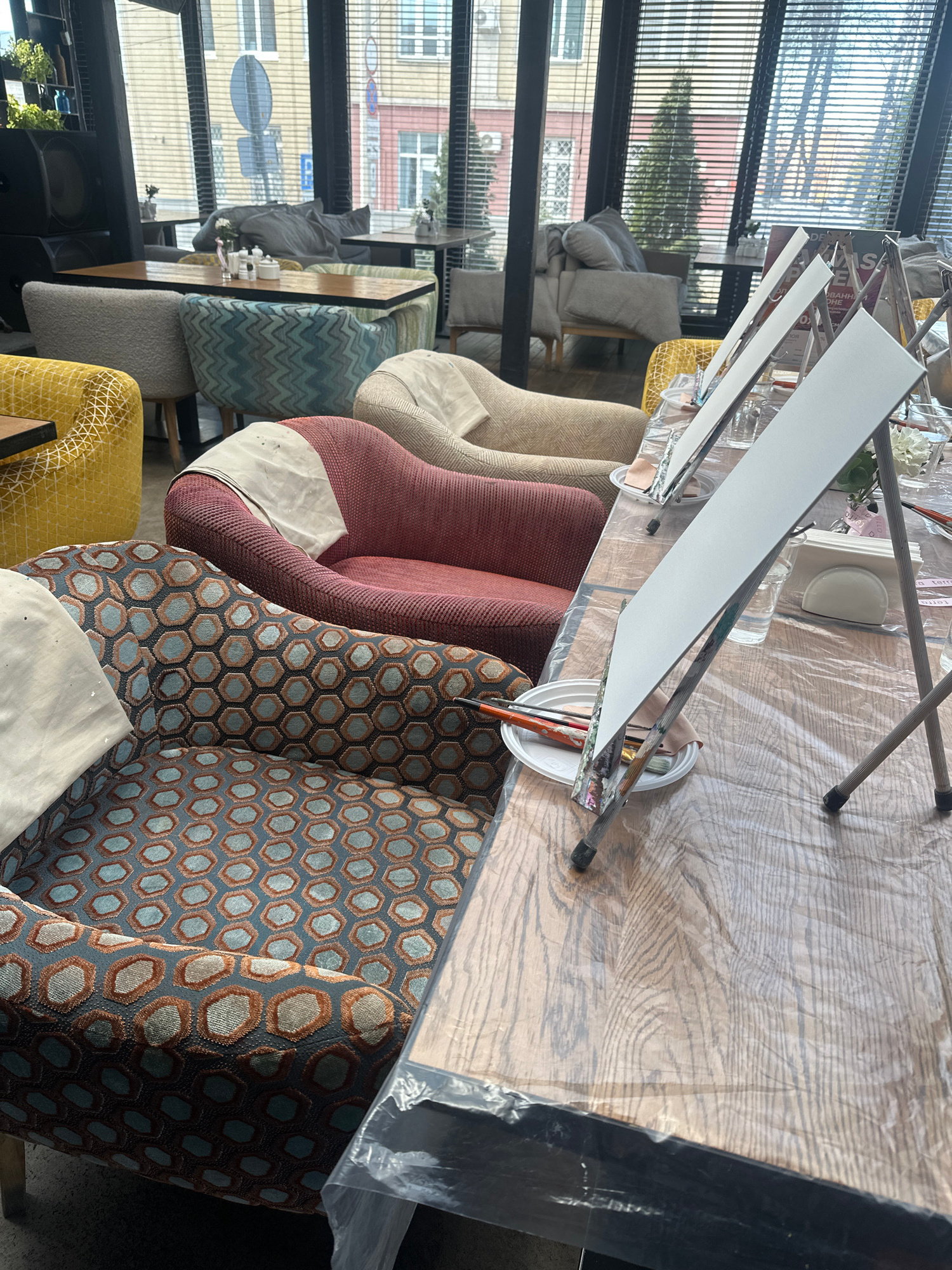 The image depicts an indoor painting event, likely in a cafe or studio space in Izhevsk, Russia. A row of upholstered chairs, each with a different pattern and color (beige, burgundy, blue/brown geome…read more