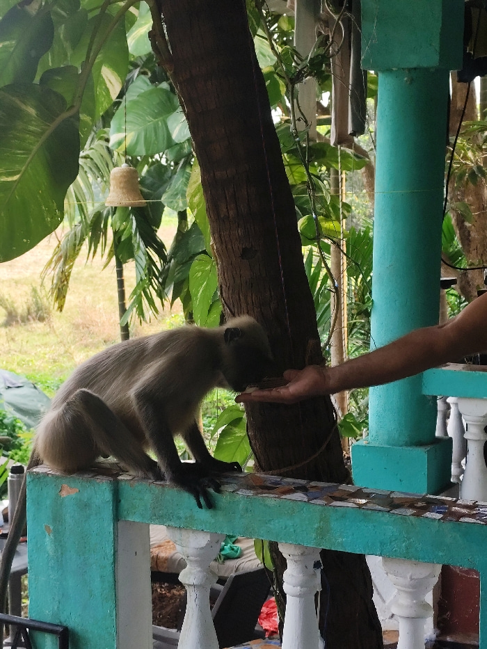 A langur monkey sits on a turquoise railing with white balusters, its head down as it eats from a person's hand. Behind the monkey, a tree trunk rises, intertwined with vines and leaves. In the backgr…read more