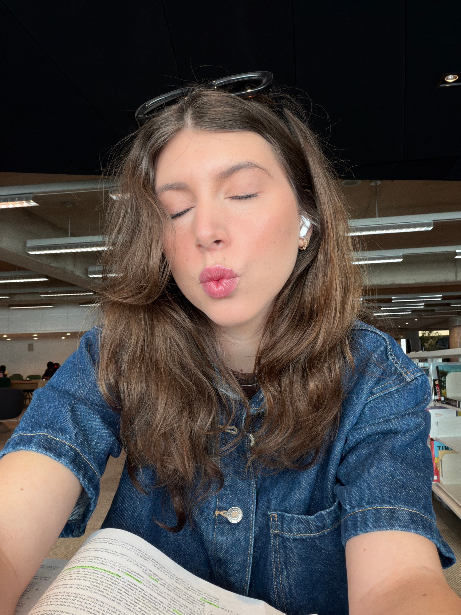 A young woman with brown wavy hair, wearing a denim jacket and wireless earbuds, is photographed indoors with her eyes closed and lips pursed. She has glasses resting in her hair and appears to be res…read more