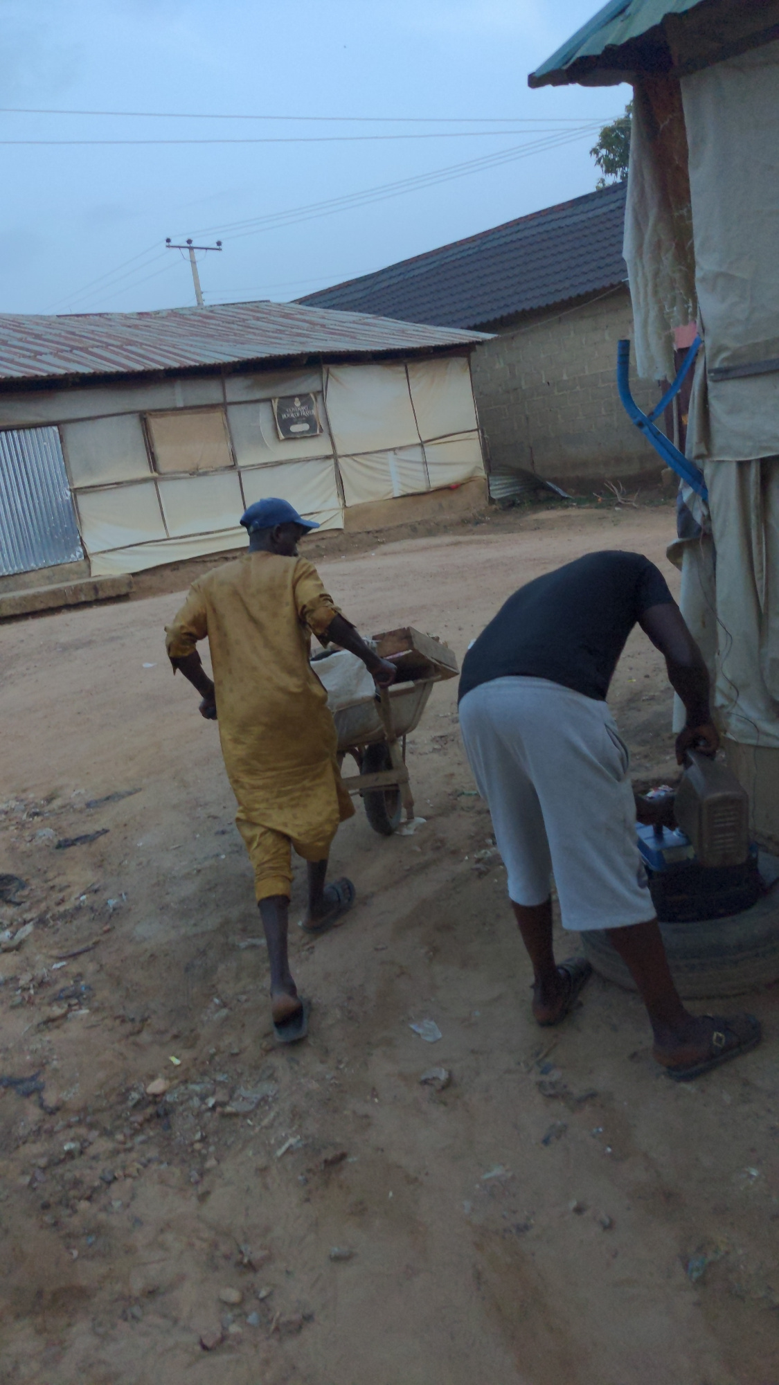 Two people stand outside a building constructed from a patchwork of materials, including corrugated metal, cloth, and wood. The man on the left wears a blue cap and a long, mustard-colored robe, standβ¦read more