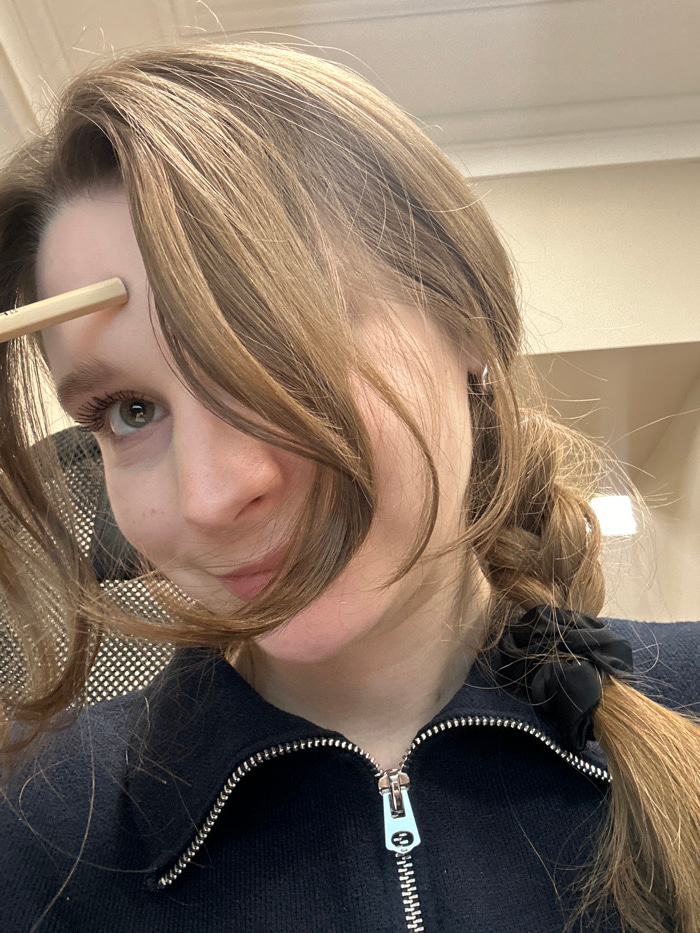 A forensic examination of the image reveals a partial, eye-level indoor scene featuring a light-skinned female individual. Her head is angled slightly to her left, with her gaze directed upward and to…read more