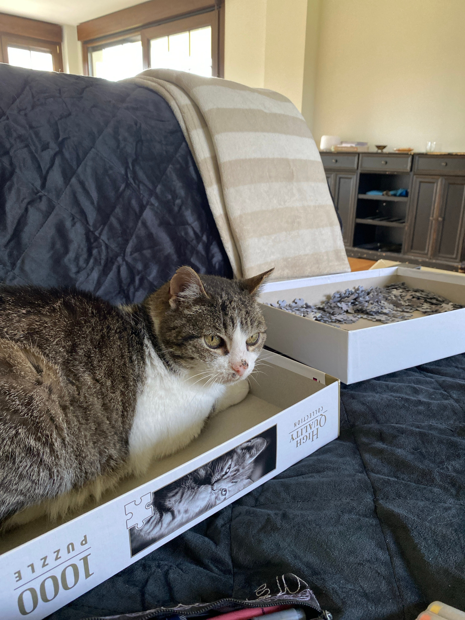 A brown and white tabby cat is lying in the lower half of a white "High Quality Collection" 1000-piece puzzle box. The upper half of the puzzle box, containing puzzle pieces, is resting on the bed abo…read more