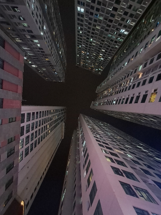 The image displays an extreme low-angle view looking directly upwards at night, showcasing multiple tall urban high-rise buildings in the city of Nha Trang, Vietnam. At least six distinct structures,…read more