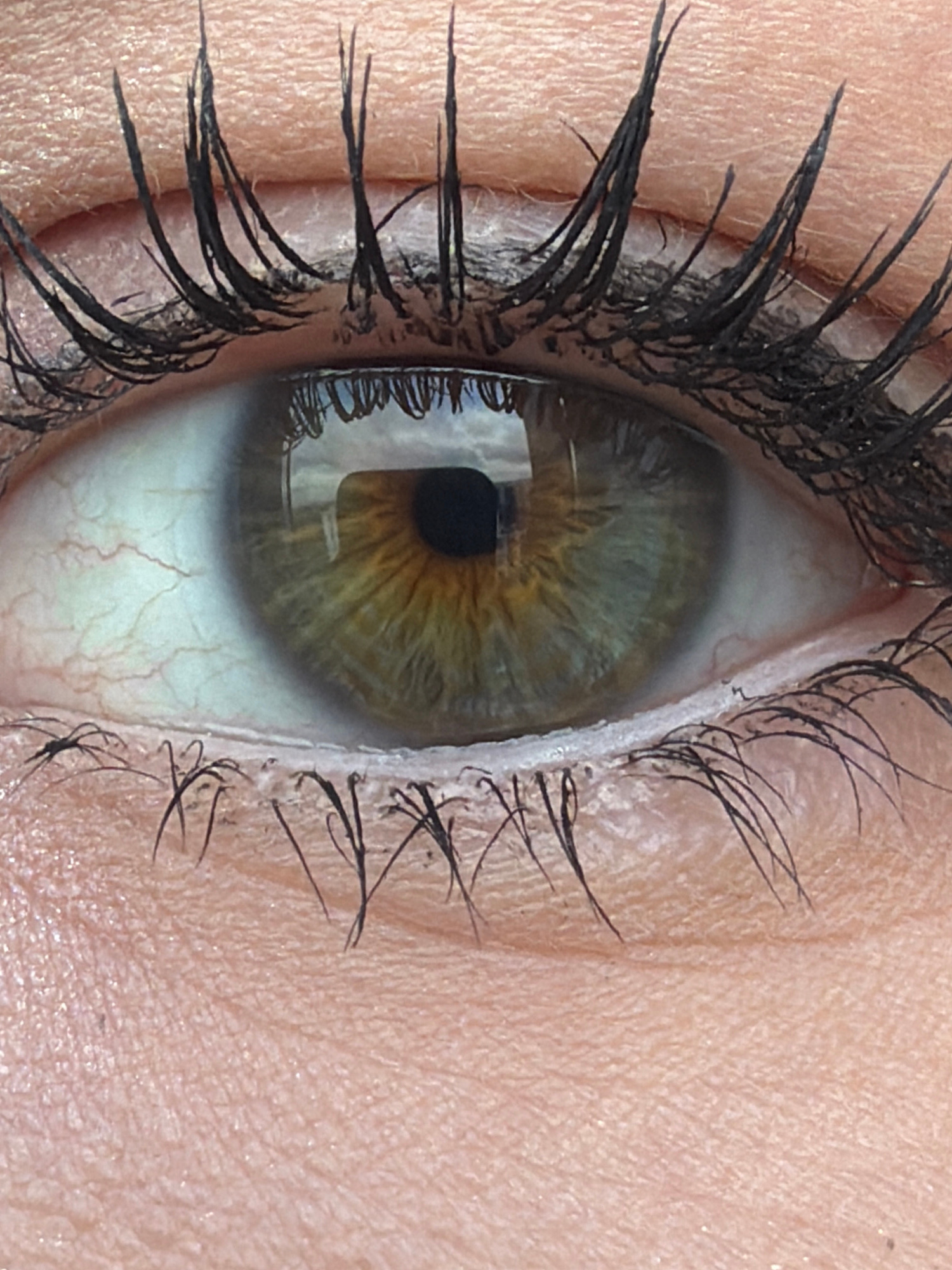 A close-up view of a human eye with hazel-colored iris and heavy black mascara on the upper lashes. The sclera exhibits visible blood vessels. The surrounding skin is light-toned. There is no indicati…read more