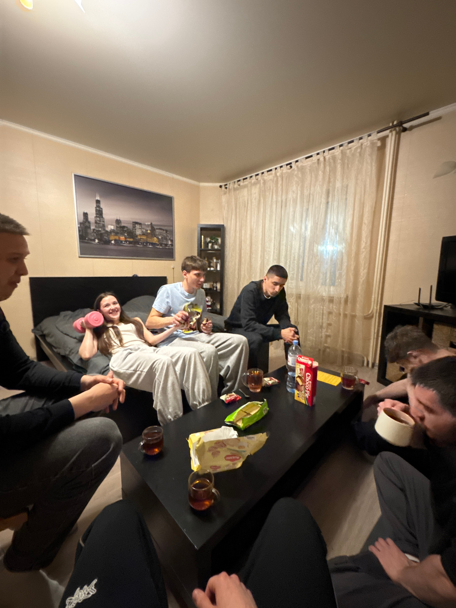 A group of young people are sitting around a black coffee table in an apartment. There are about seven people visible. Some are seated on a couch. On the table are snacks, drinks, and a box of Choco-P…read more