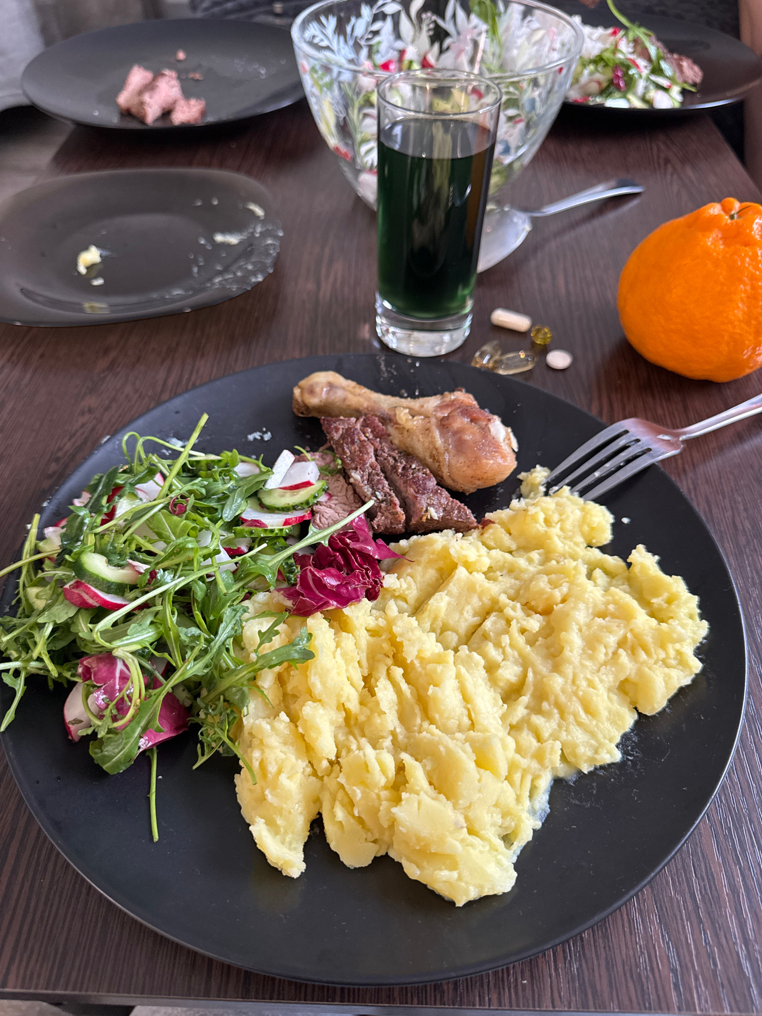 A meal is displayed on a dark brown wooden table, likely set indoors in Murino, Russia. The central feature is a large black, roundish plate holding a generous portion of light yellow mashed potatoes.…read more