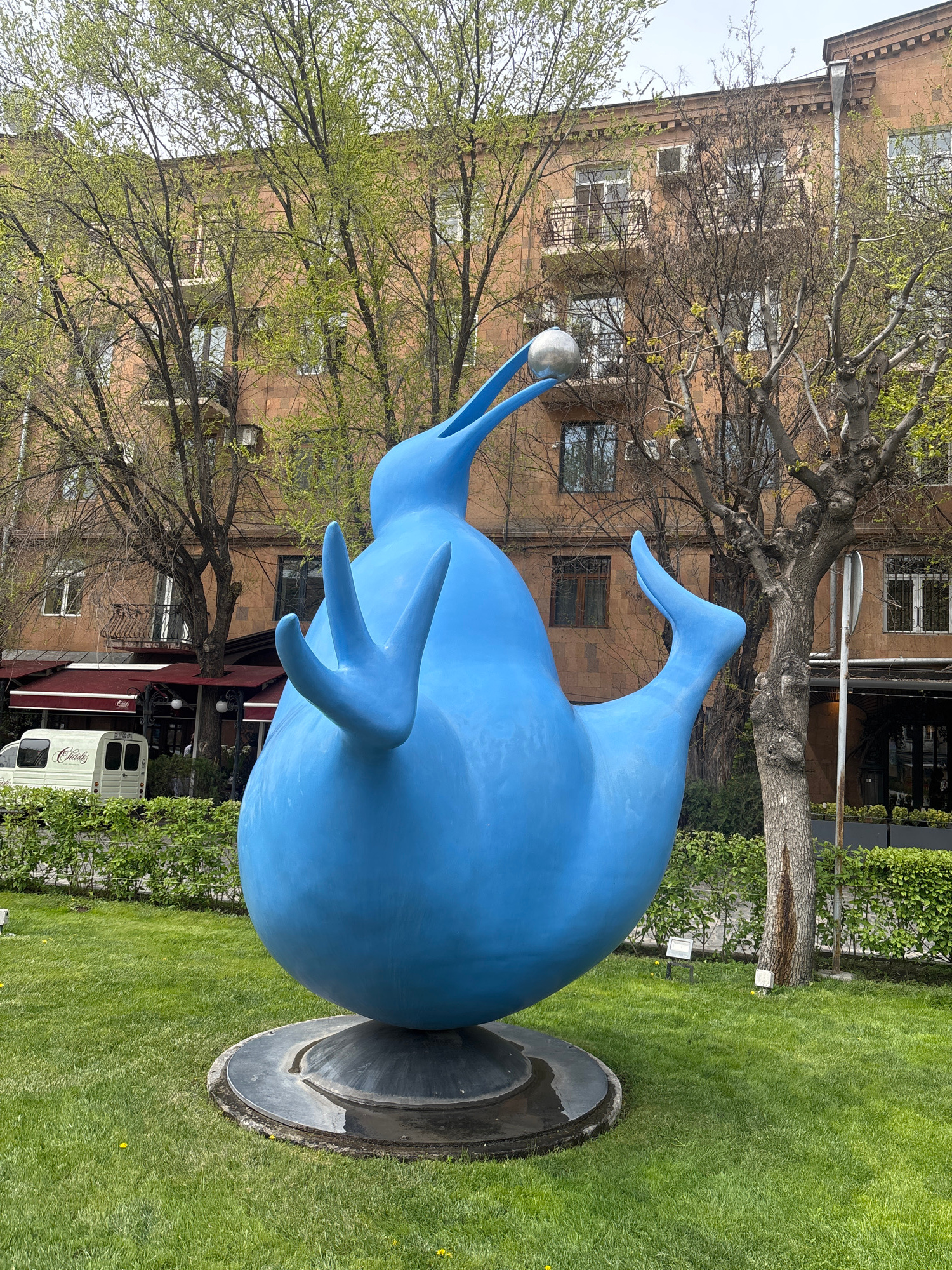 The image shows a blue sculpture of an animal, possibly a whale, holding a silver ball, located in Yerevan, Armenia. The sculpture is positioned on a circular, gray base set in a green lawn. A multi-s…read more