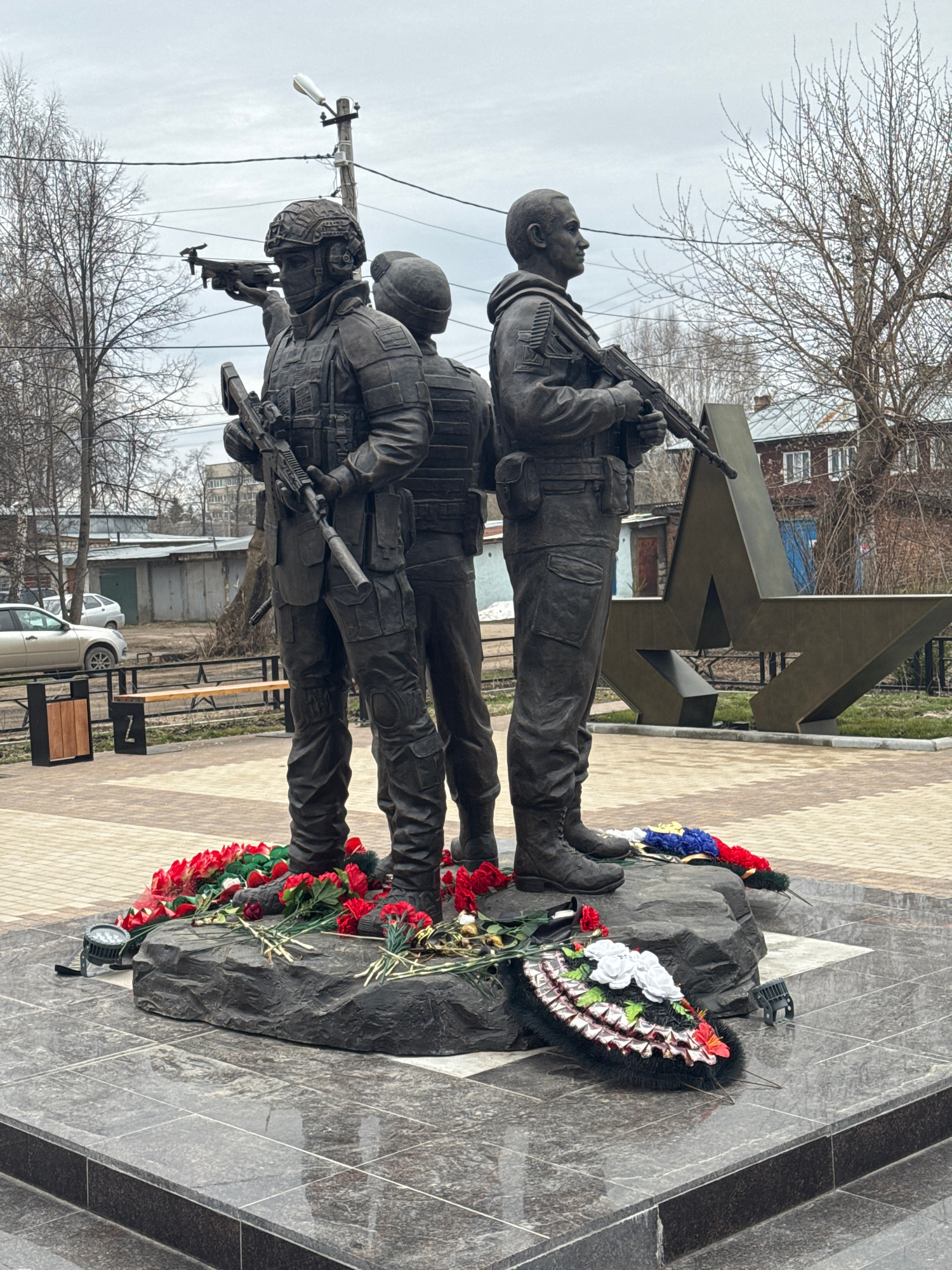 The image shows a monument in the city of Kungur, Russia. It consists of three bronze statues of soldiers with rifles in combat gear. Behind them is a large, metal "Z" symbol. At the base of the monumβ¦read more