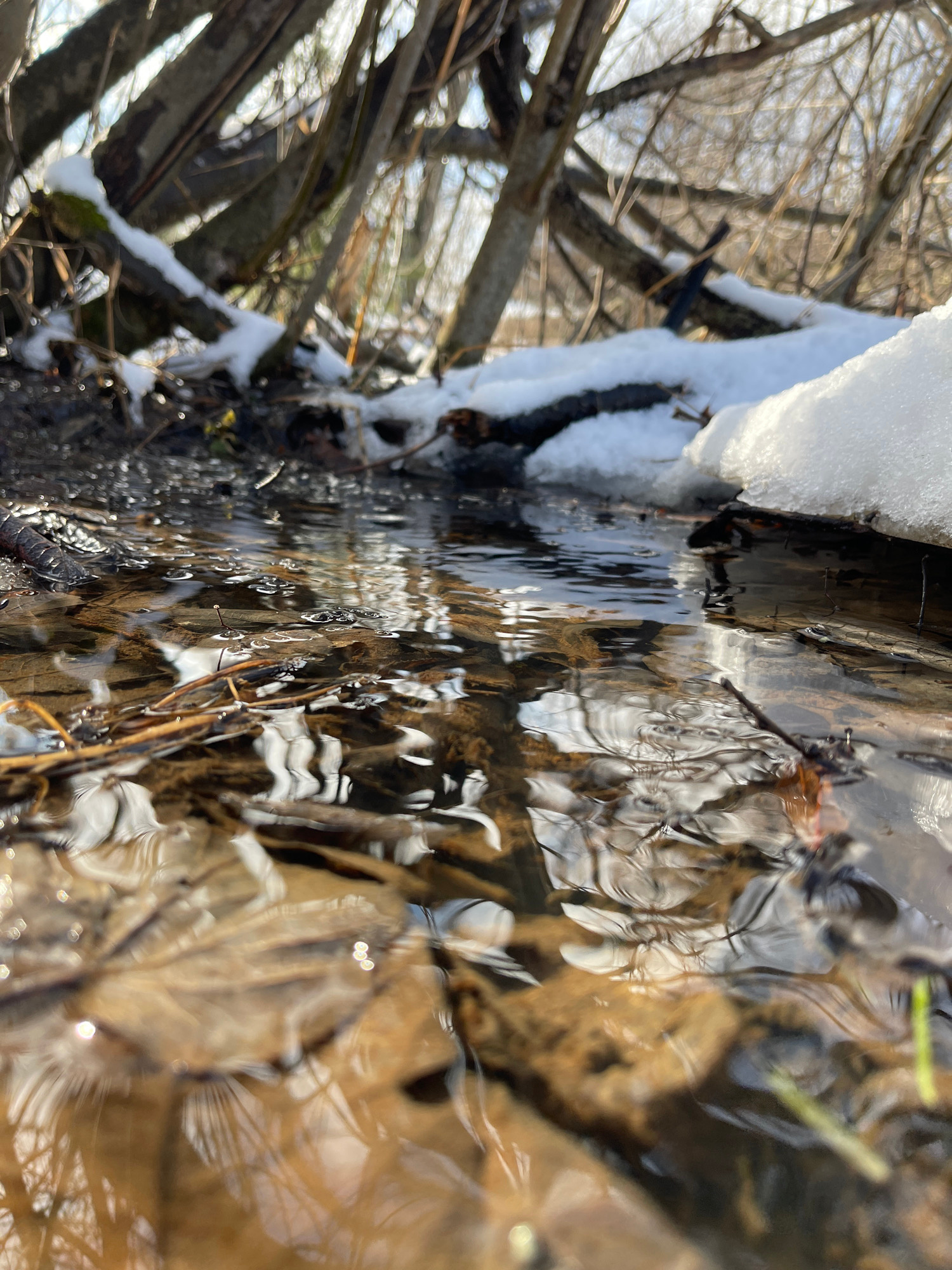 The image shows a close-up view of a small stream flowing over a fallen log. The left side of the image is filled with water reflecting submerged leaves and branches. The water is clear enough to see the details of the debris beneath. The log is partially covered in snow and ice on the right side. Bare tree branches are visible in the background, indicating a winter scene. The image seems to be taken at ground level or very close to it, focusing on the interaction of water, wood, and snow in a natural setting. Zhigalki, Russia, is not apparent in the image. | Open Wire