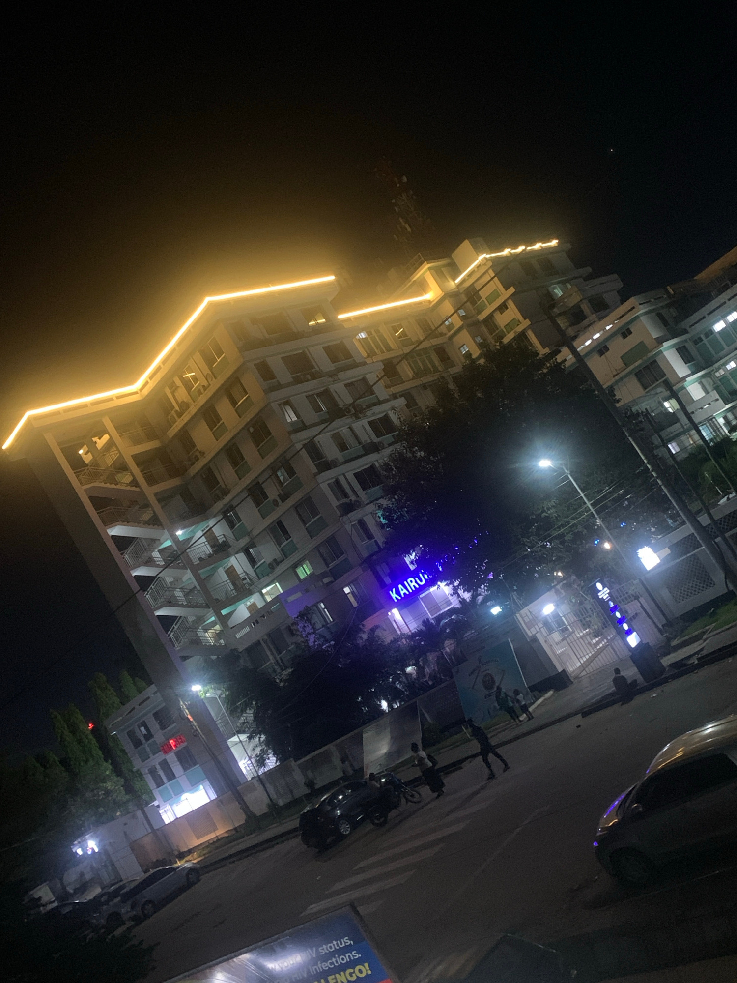 At night, the city of Dar es-Salaam, Tanzania, is depicted at street level, rotated slightly clockwise. A tall building with a jagged yellow-lit edge is illuminated. The windows, mostly lit, reveal fl…read more
