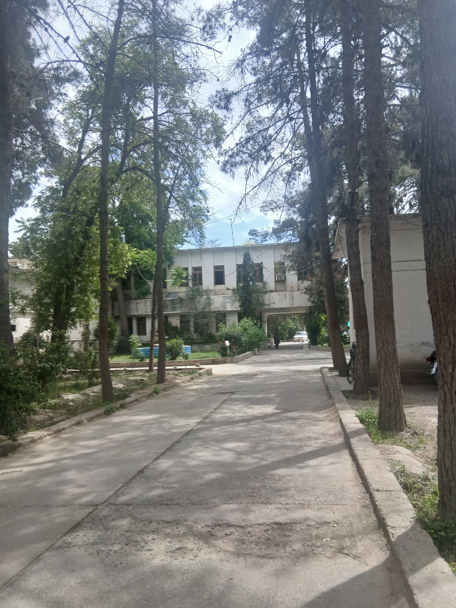 The image depicts a paved walkway flanked by trees, leading towards a white, multi-story building. The scene appears to be in Quetta City Tehsil, Pakistan. The walkway is concrete with a distinct seam…read more
