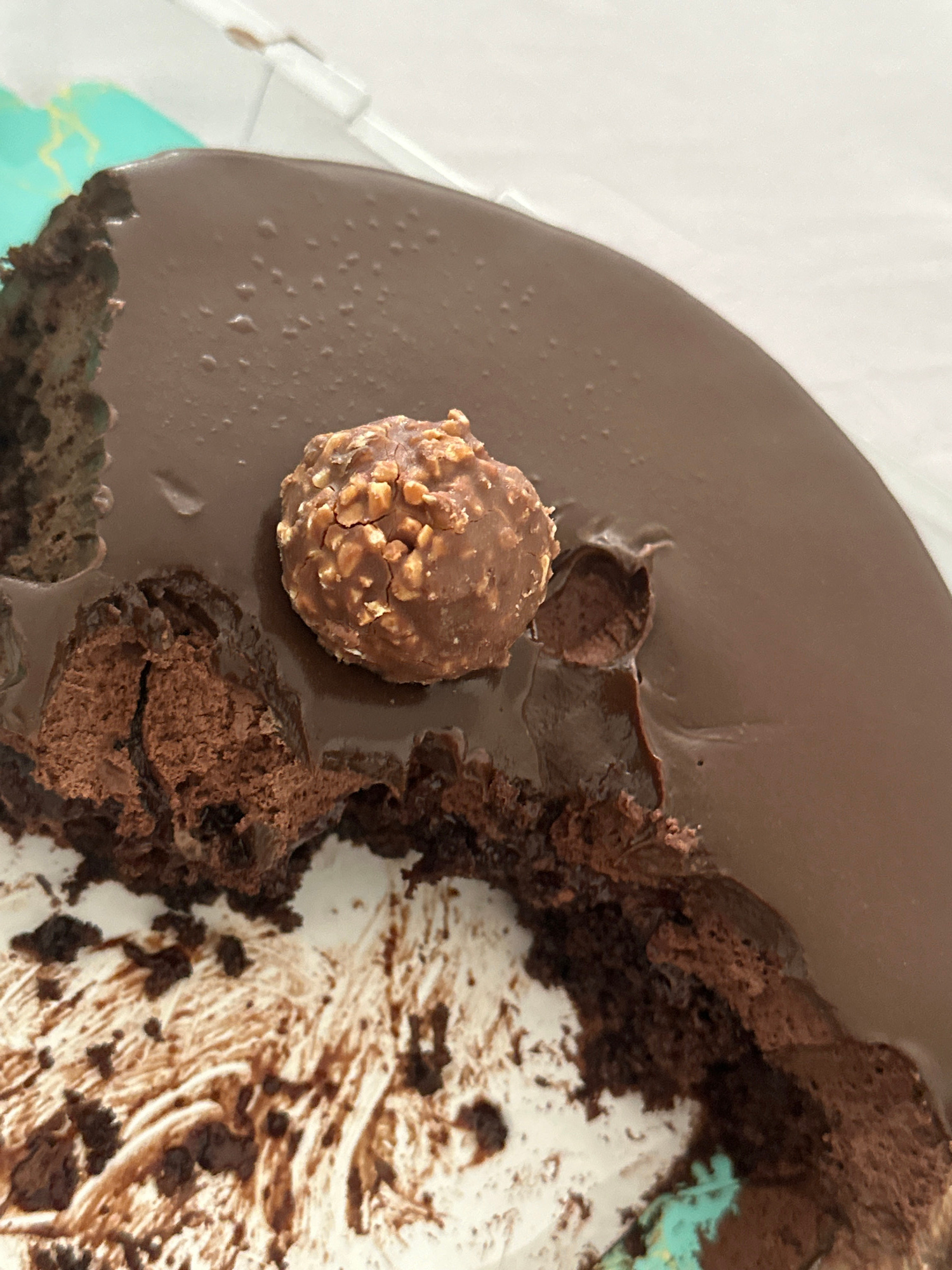 A partially eaten chocolate cake is on a white plate with turquoise and white decorative accents. A Ferrero Rocher candy sits on top of the cake's chocolate ganache. The environment is not specified. | Open Wire