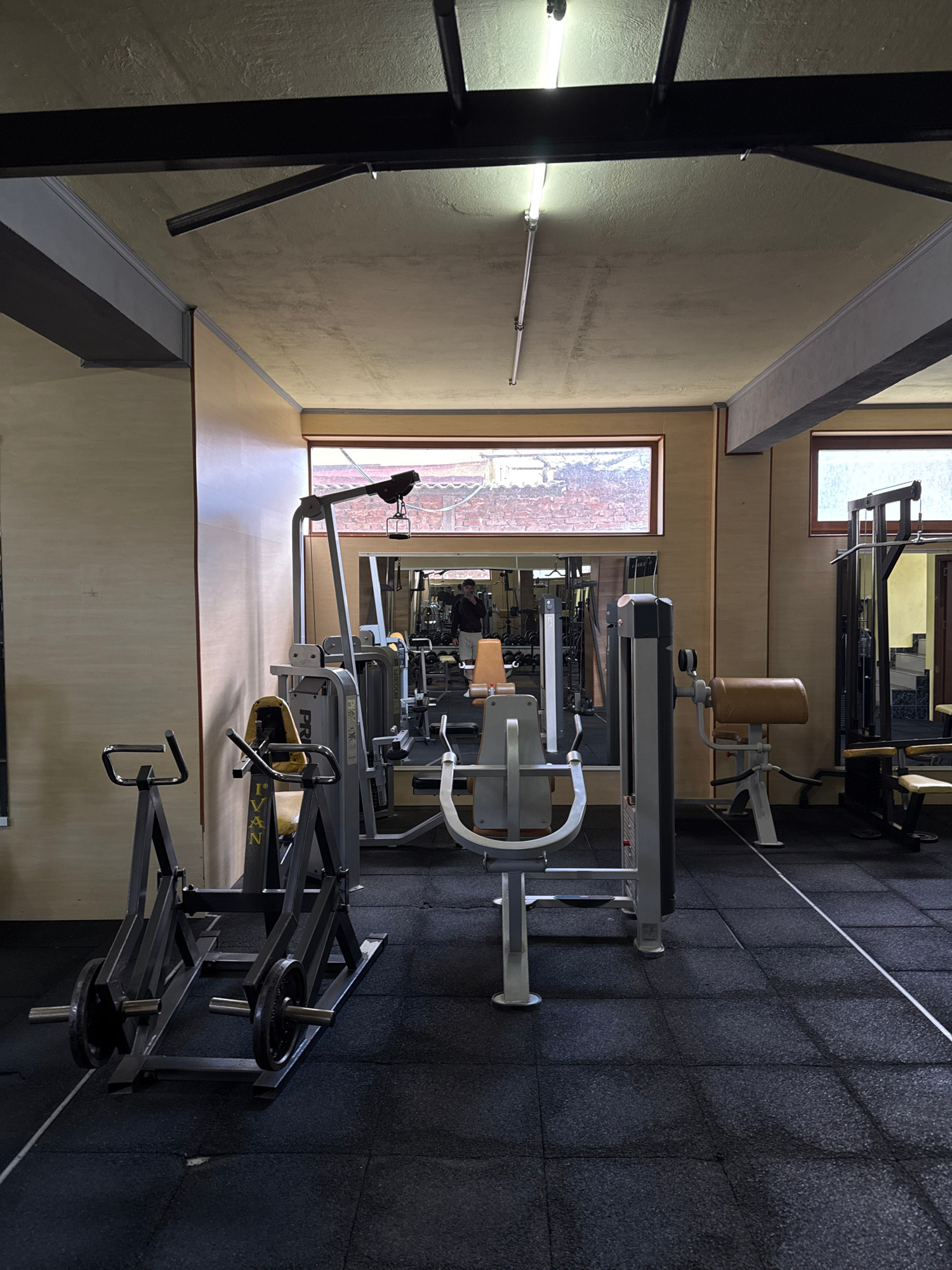 The image depicts the interior of a gym. A variety of weight machines are positioned along a wall with windows. The floor is black. Fluorescent lighting is visible on the left wall. The location is Go…read more