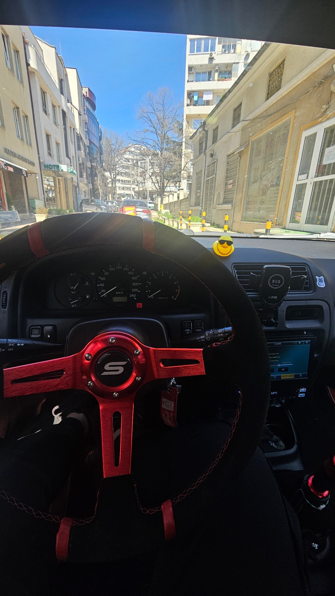 A view from inside a vehicle shows a car's dashboard and steering wheel, with a cityscape visible through the windshield. The steering wheel is black with a red rim and has a stylized, red "S" logo in…read more