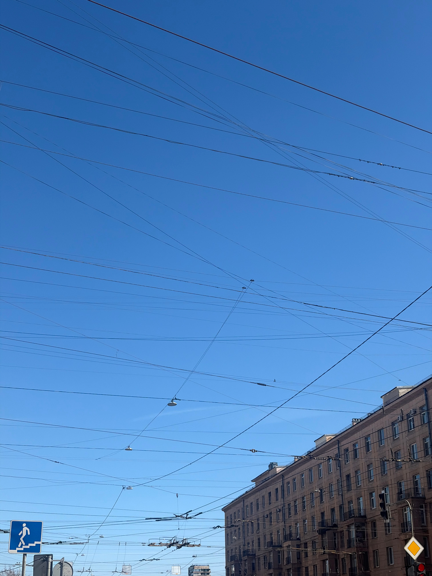 The image captures a clear, blue sky in Saint Petersburg, Russia. Power lines crisscross the sky, running from the side of a building on the right side of the image, where an emergency sign and a traf…read more