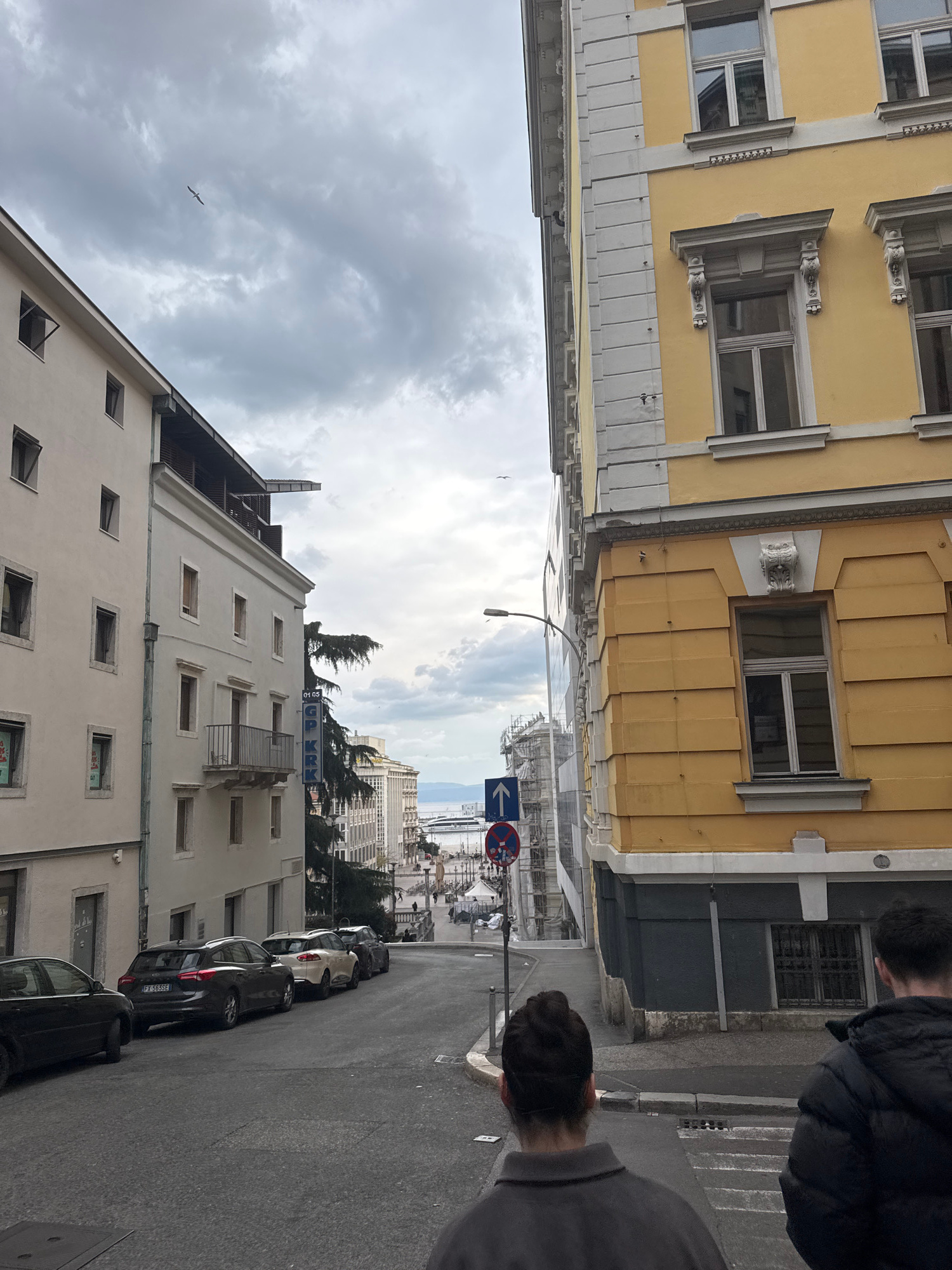The image depicts a street in Grad Rijeka, Croatia. Two people are partially visible on the right side of the frame. Buildings line both sides of the street, with a beige building on the right and a y…read more