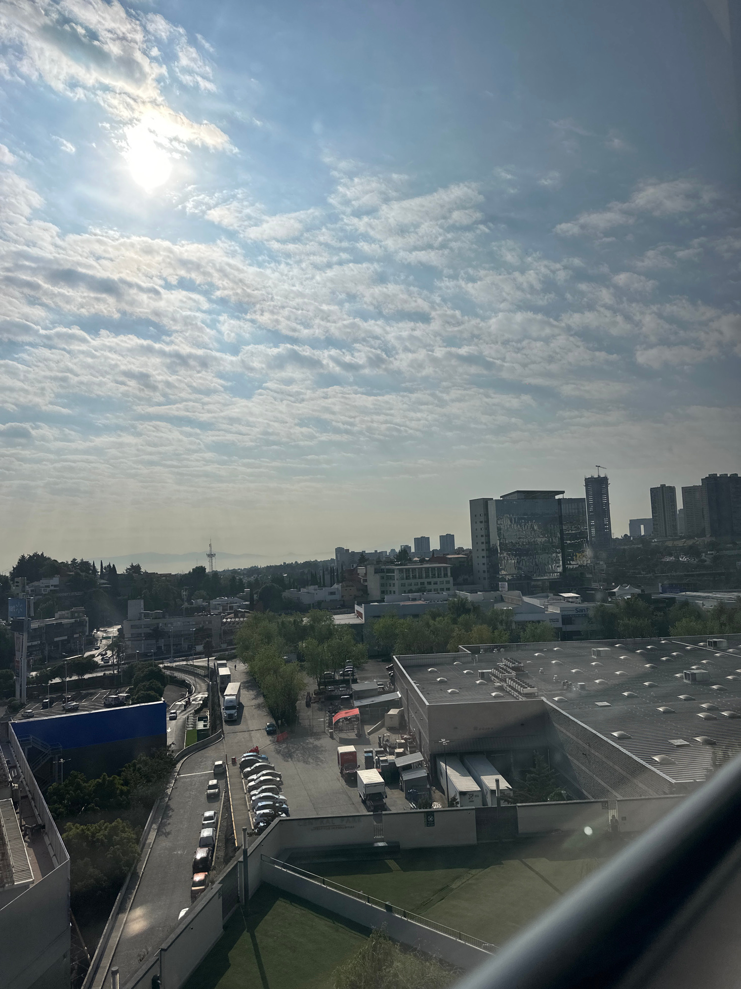 A daytime view from a high vantage point in Huixquilucan de Degollado, Mexico. The sky is visible with numerous small clouds. A cityscape is visible with high-rise buildings in the distance and a vari…read more