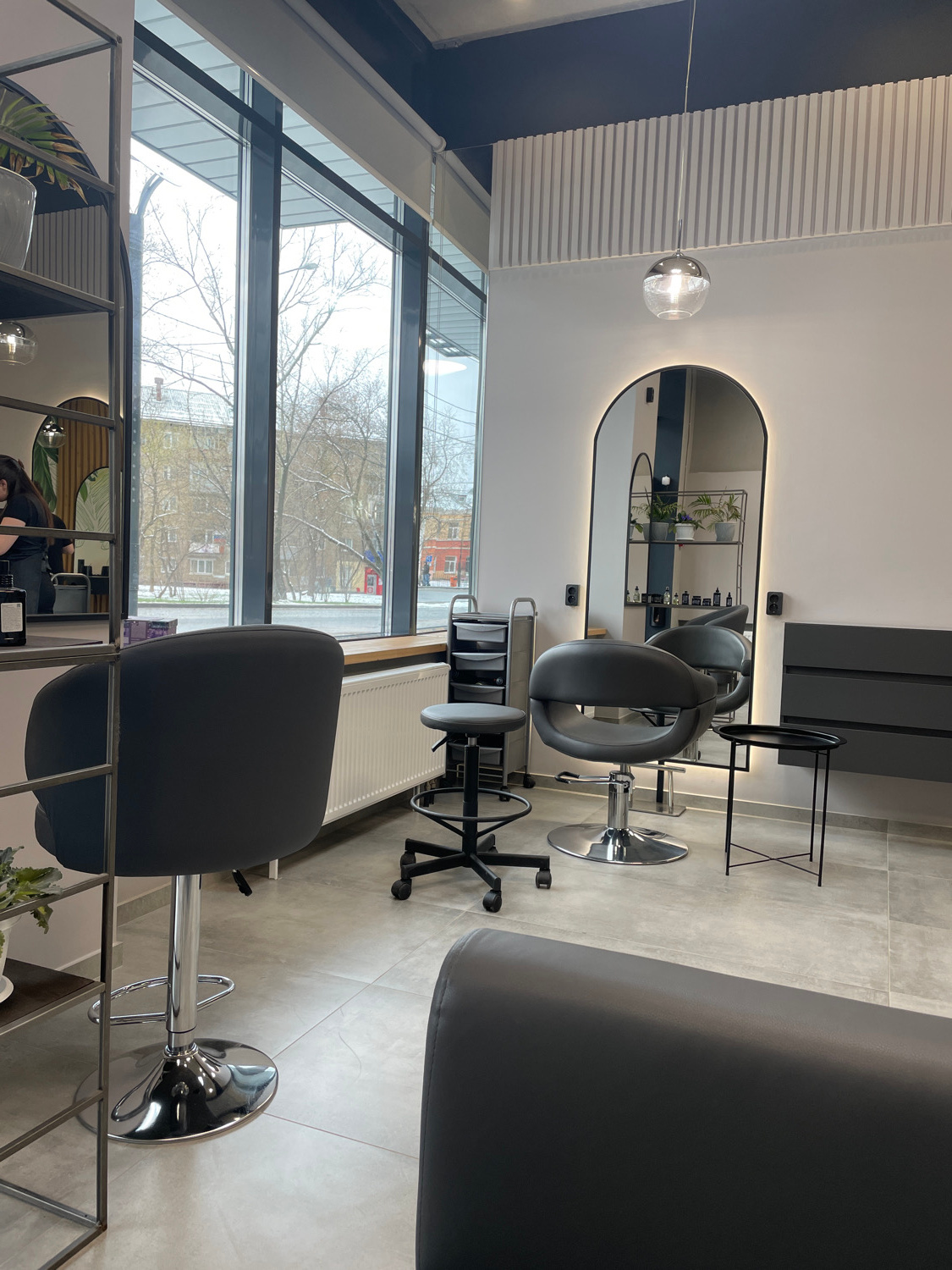 The image depicts the interior of a modern, minimalist hair salon or beauty studio, located in Perm, Russia. The room features a predominantly gray and black color palette, accented by white walls and…read more