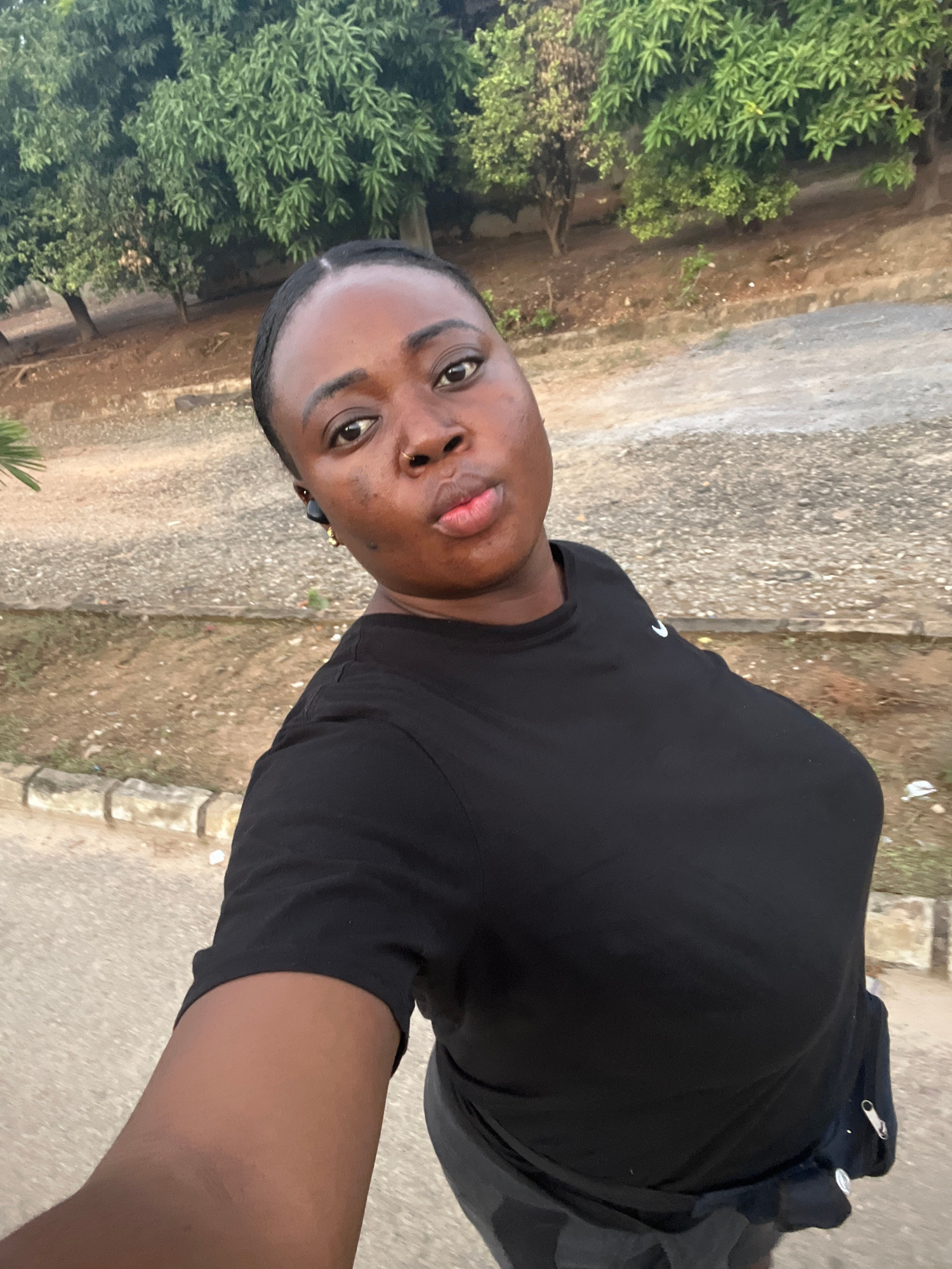 The image is a selfie taken outdoors in what appears to be a residential area in Abuja, Nigeria. A person with brown skin and short black hair is wearing a plain black t-shirt. The background shows a…read more