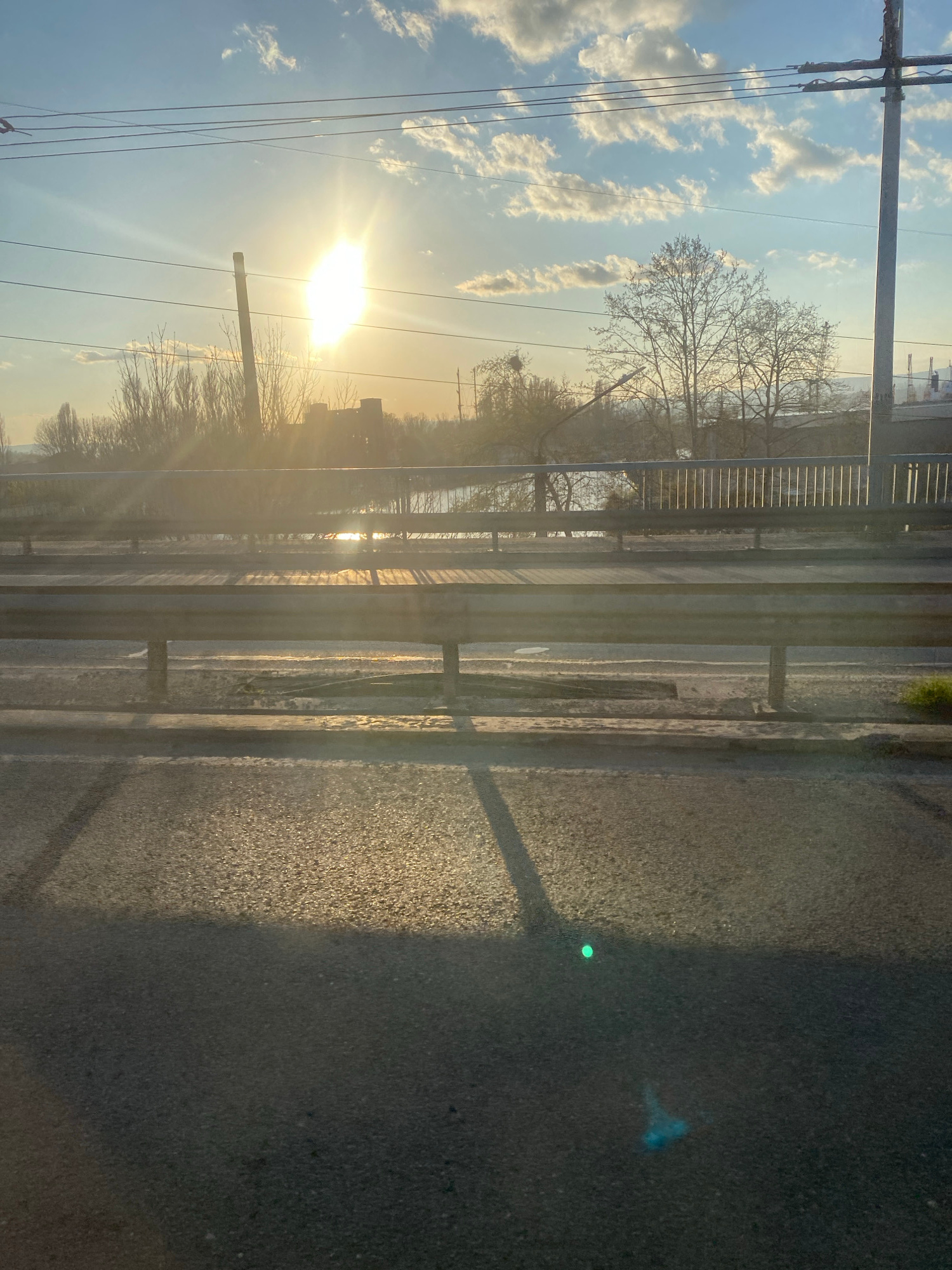 The image shows a view from a bridge or elevated structure, potentially in Varna, Bulgaria, although there's nothing definitively identifying it as such. A metal railing runs horizontally across the f…read more