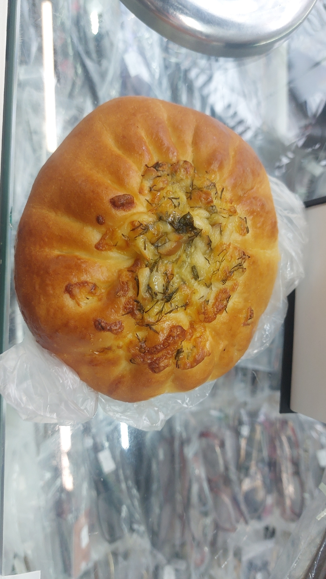 A top-down, eye-level shot depicts a round, golden-brown baked pastry in a clear plastic bag, resting on a glass surface. The pastry is topped with melted cheese and green herbs. The background includ…read more
