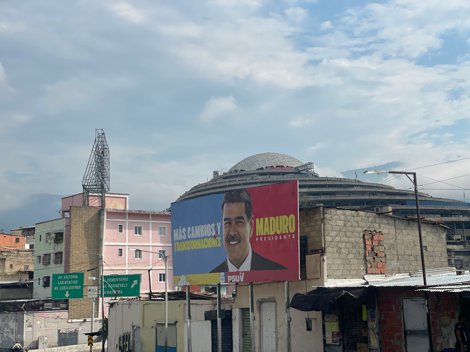 The image depicts a cityscape in Caracas, Venezuela, with a large billboard featuring Nicolás Maduro, the President of Venezuela. The billboard is divided into two sections, with a blue background on…read more