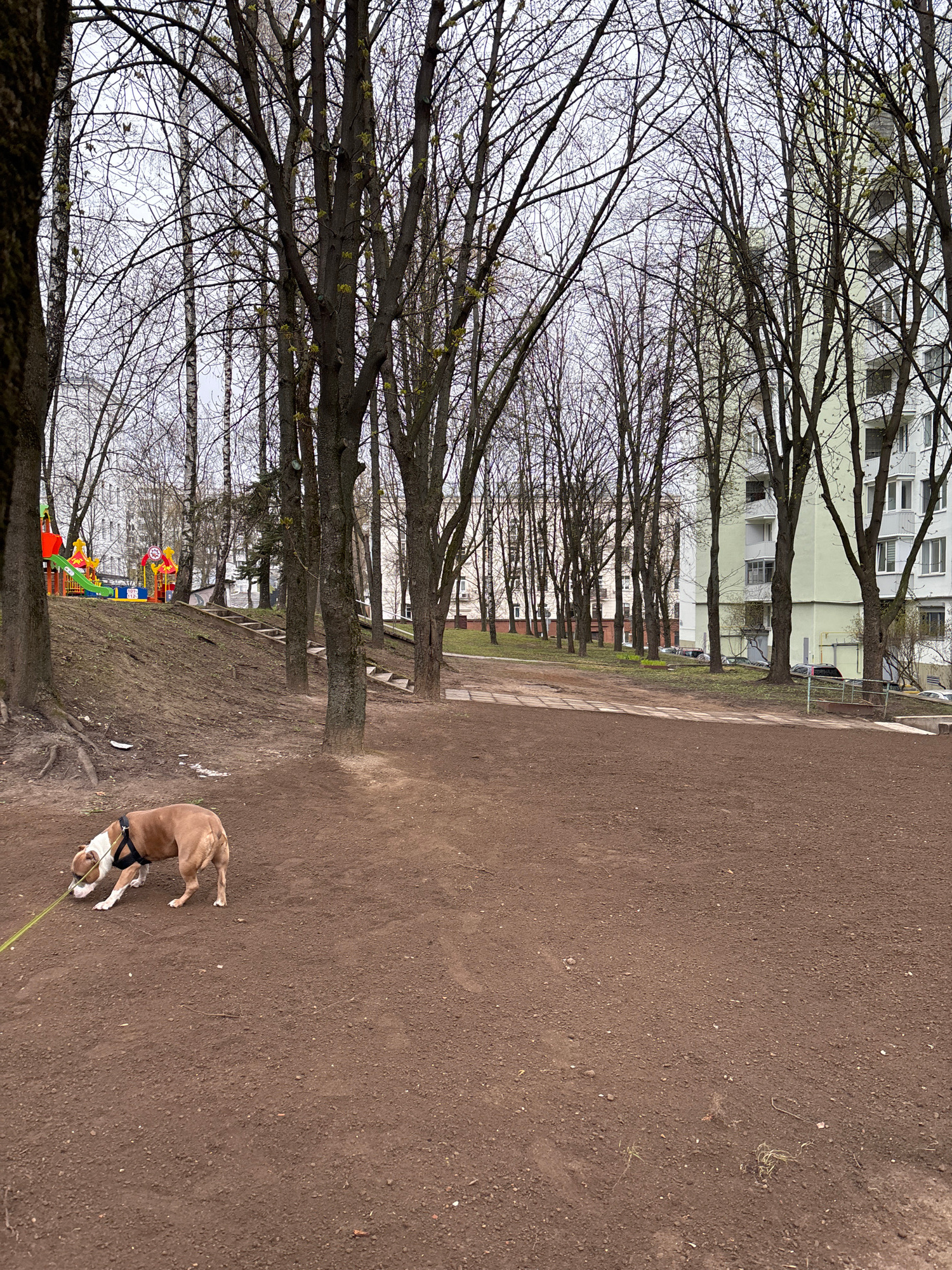 The image depicts an outdoor scene, likely a park or recreation area, in Minsk, Belarus, based on the style of architecture present in the buildings in the background. A tan and white dog, wearing a h…read more
