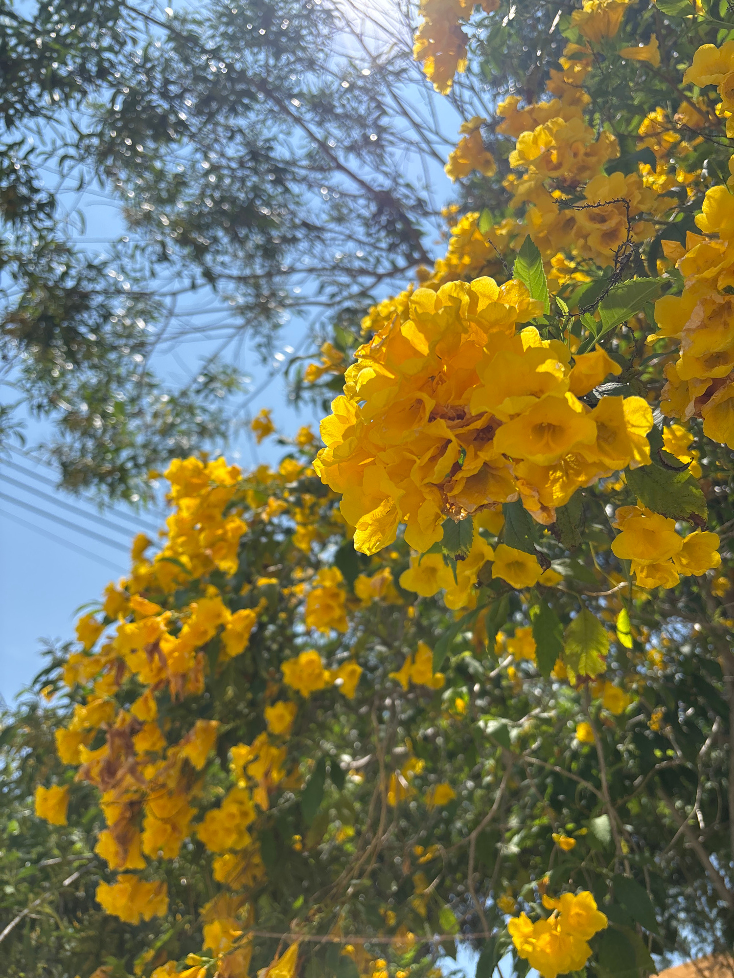 The image shows a low-angle view of yellow flowers blooming on branches against a light blue sky. Some branches with green leaves are visible. In the lower left corner, blurred outlines of what appear…read more