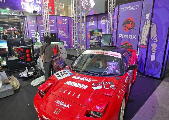 The scene depicts an indoor exhibition booth within a large convention hall, likely Makuhari Messe in Chiba, Japan. A bright red Honda NSX sports car, extensively covered with sponsor decals including…read more