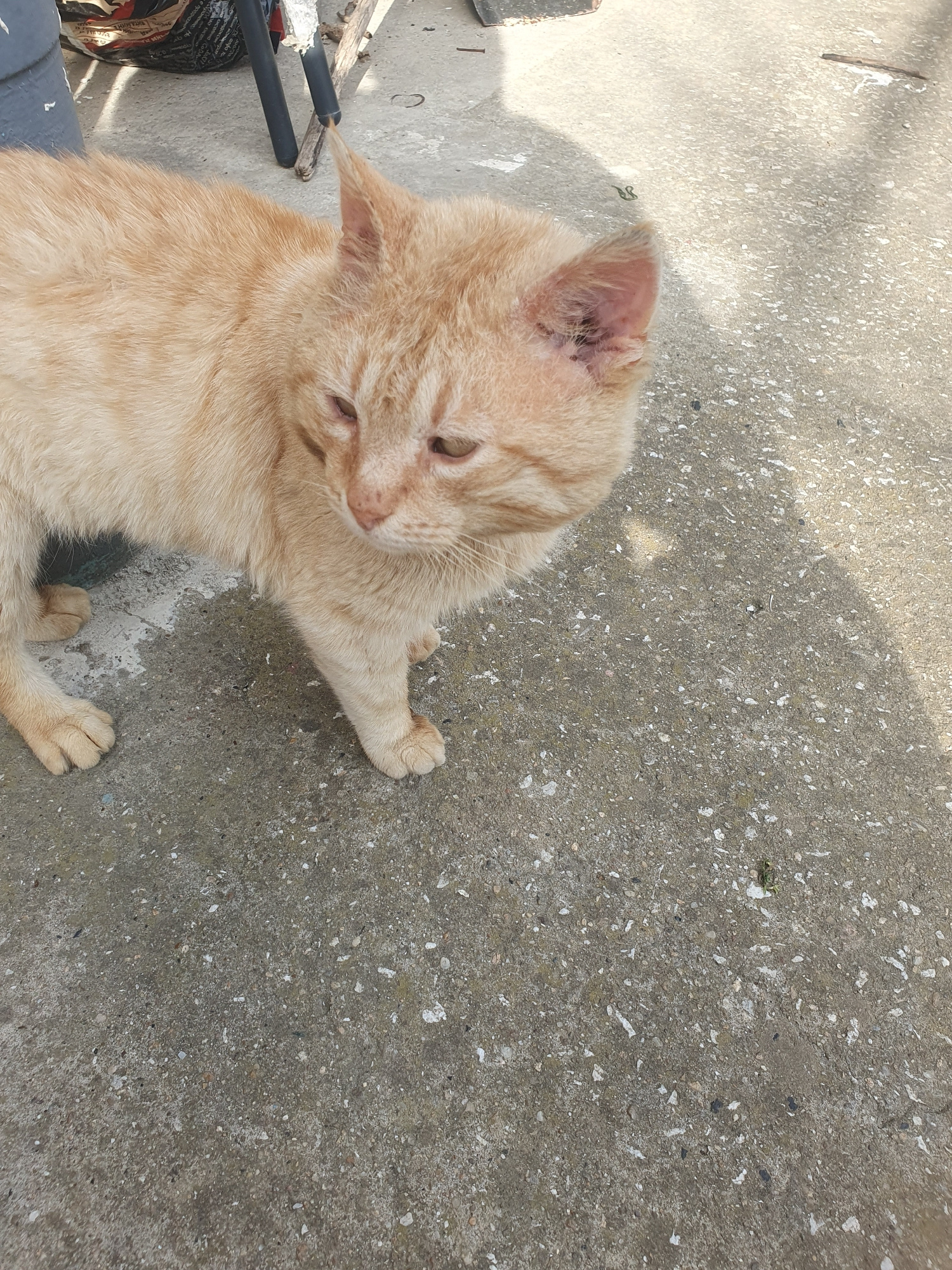 An orange tabby cat is sitting on a gray concrete surface in Хаджийско, Bulgaria. The cat is positioned to the left of the frame, looking down with its front paw extended slightly. The concrete has a…read more