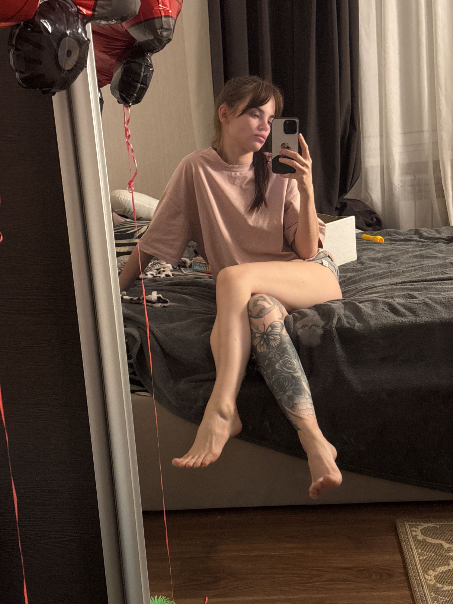 A woman is taking a selfie in a mirror. She is lying on her side on a bed, with her legs outstretched and tattooed. She is wearing a pink t-shirt and shorts. A phone is in her left hand. The bed has a…read more