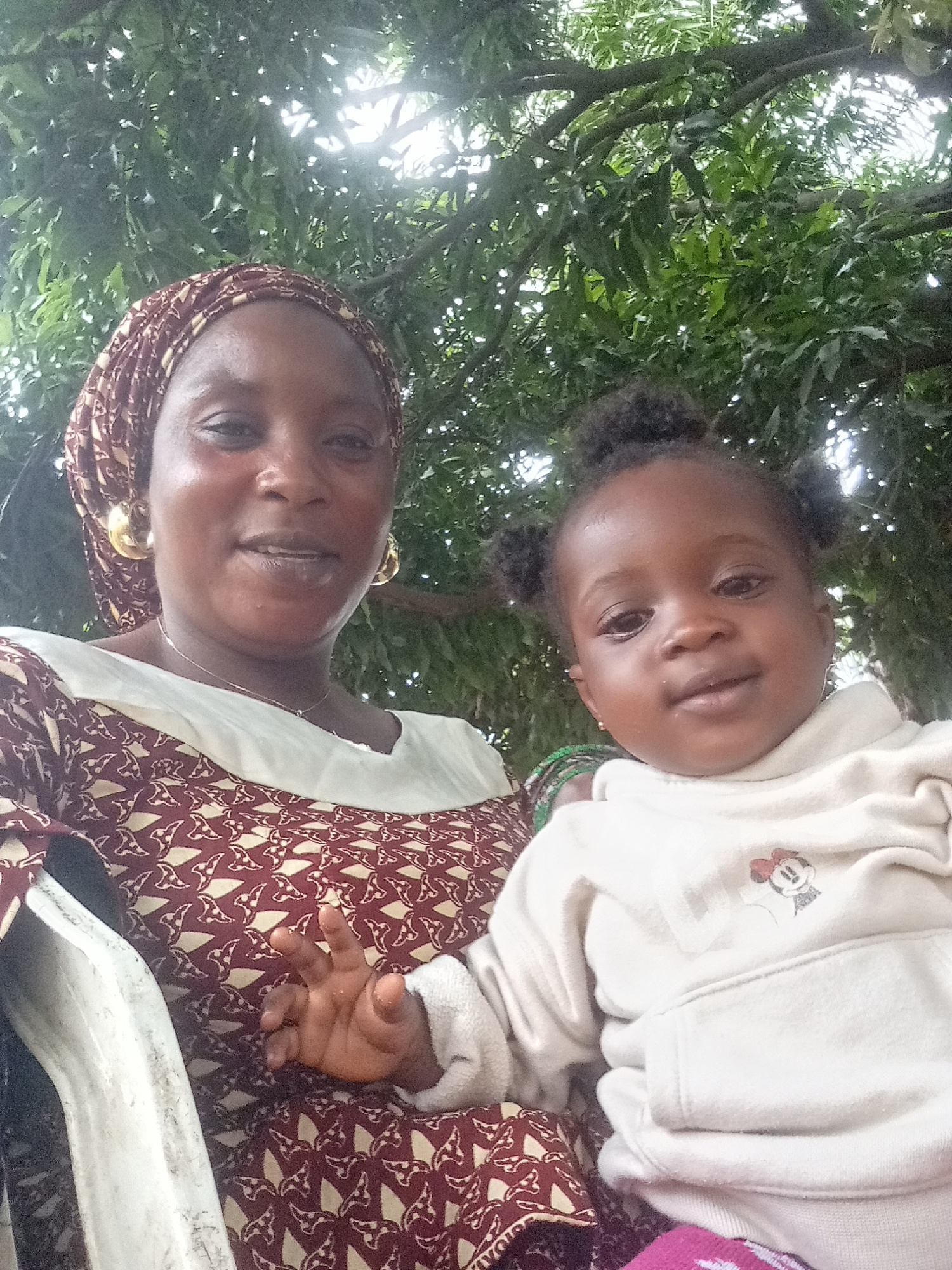 The image features an adult woman and a young child posing for a close-up photo outdoors in Andaha, Nigeria. The woman, with a medium-dark complexion, wears a patterned maroon and off-white head cover…read more