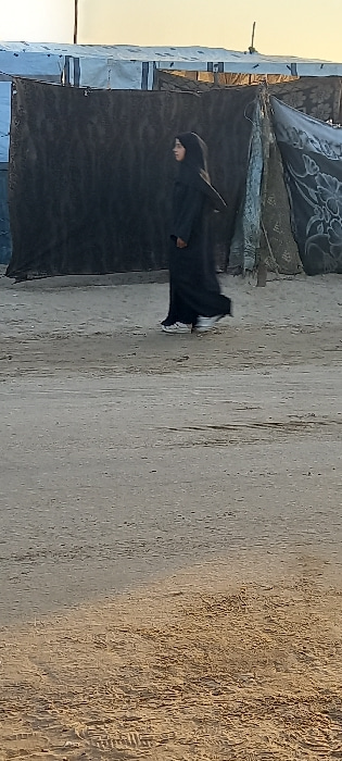 A young female, appearing to be in her late teens or early twenties, walks from left to right across a compacted dirt and sand ground. She is dressed in a full-length black abaya and a black hijab, wi…read more