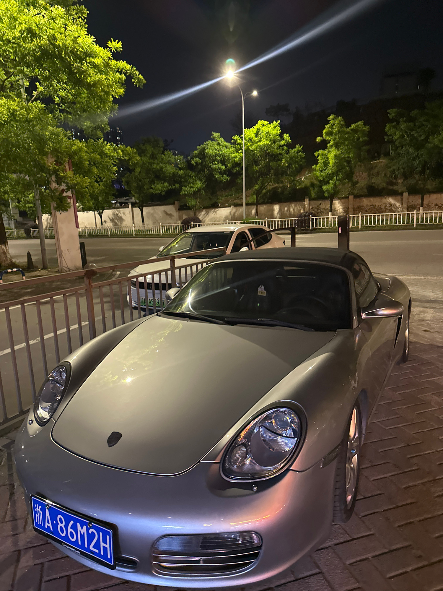 A silver Porsche sports car is prominently featured, parked outdoors at night in Chongqing High-tech Zone, China. The car's front end, including its distinctive headlights, grille, and hood, is in vie…read more