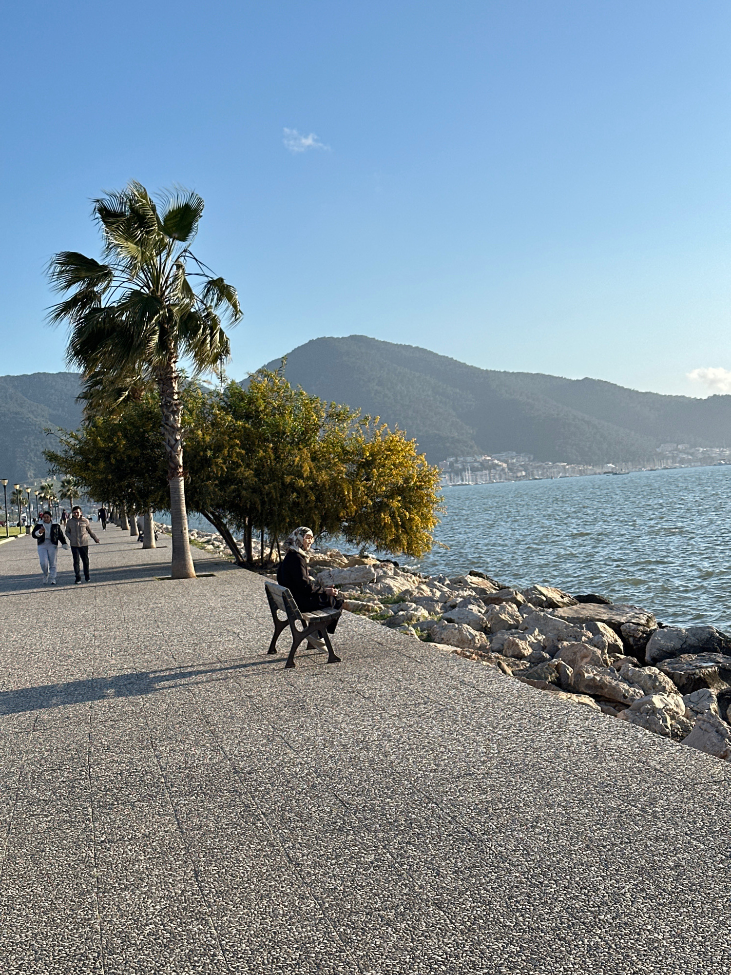 The image depicts a sunny outdoor scene along a waterfront promenade. A palm tree stands prominently to the left, with a line of trees extending down the walkway. People are strolling and relaxing on…read more