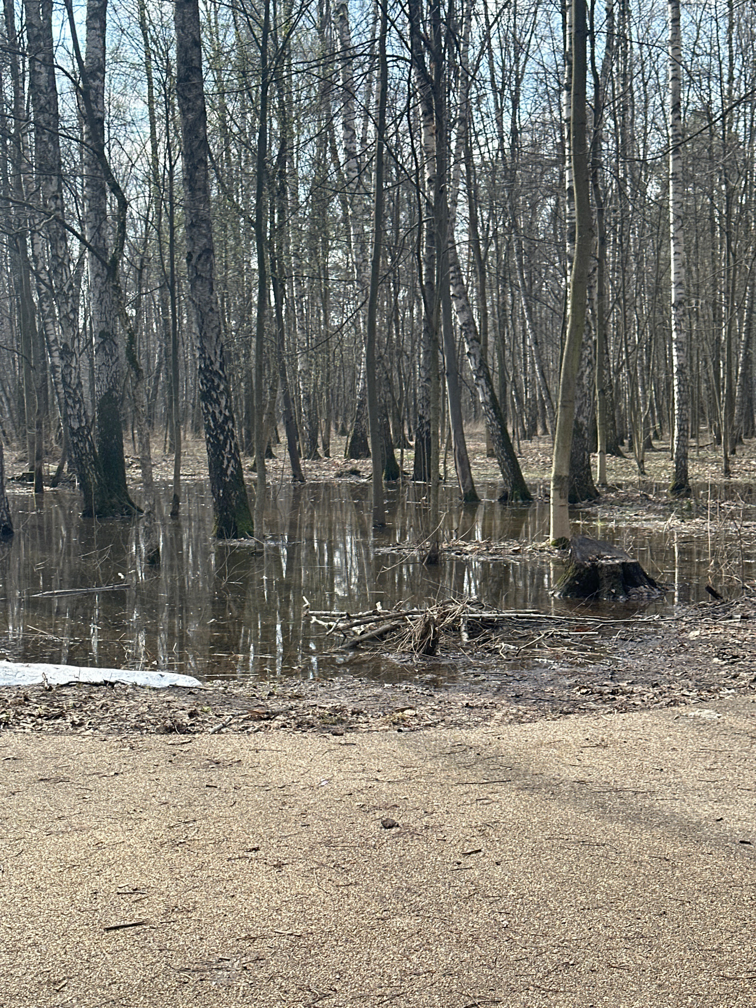The image shows a flooded section of a park in Moscow, Russia. The standing water reflects the bare trees of a birch forest. To the right of the water is a sandy path.