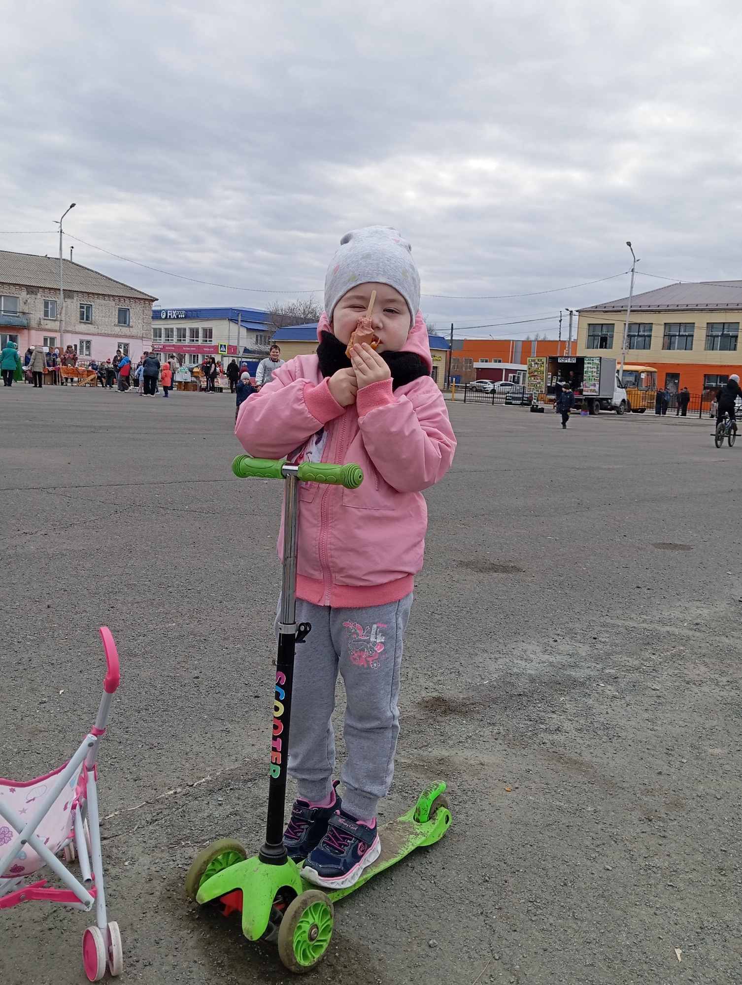 A young girl is eating a snack while standing on a green scooter in Yurgamysh, Russia. She is wearing a pink jacket, grey pants, a grey hat, and colorful sneakers. The scooter has black lettering that…read more