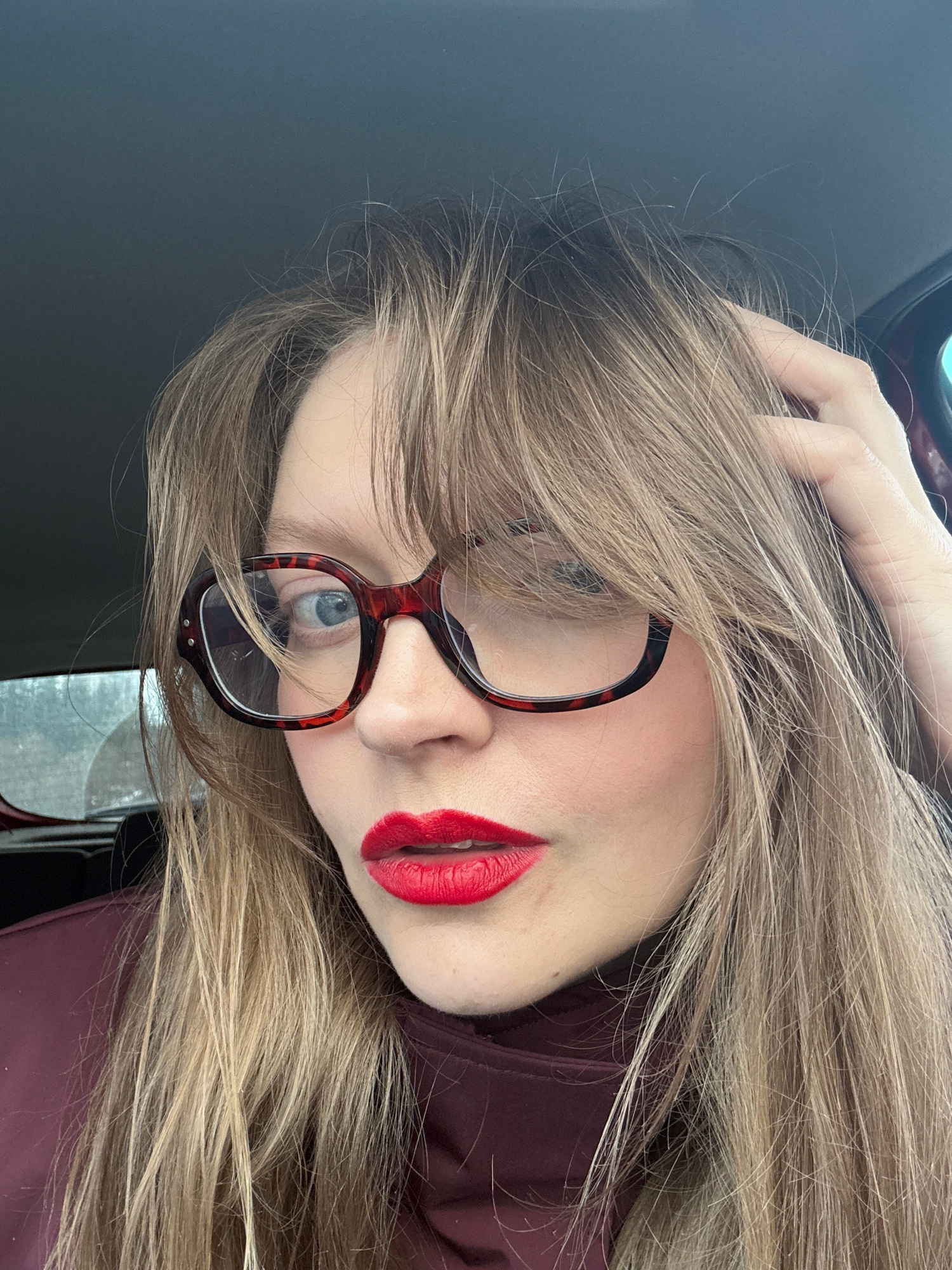 A woman is positioned at an angle, wearing red lipstick and tortoise-shell glasses. Her hand is in her hair. The background is a dark gray color. There is nothing in the image to indicate the location…read more