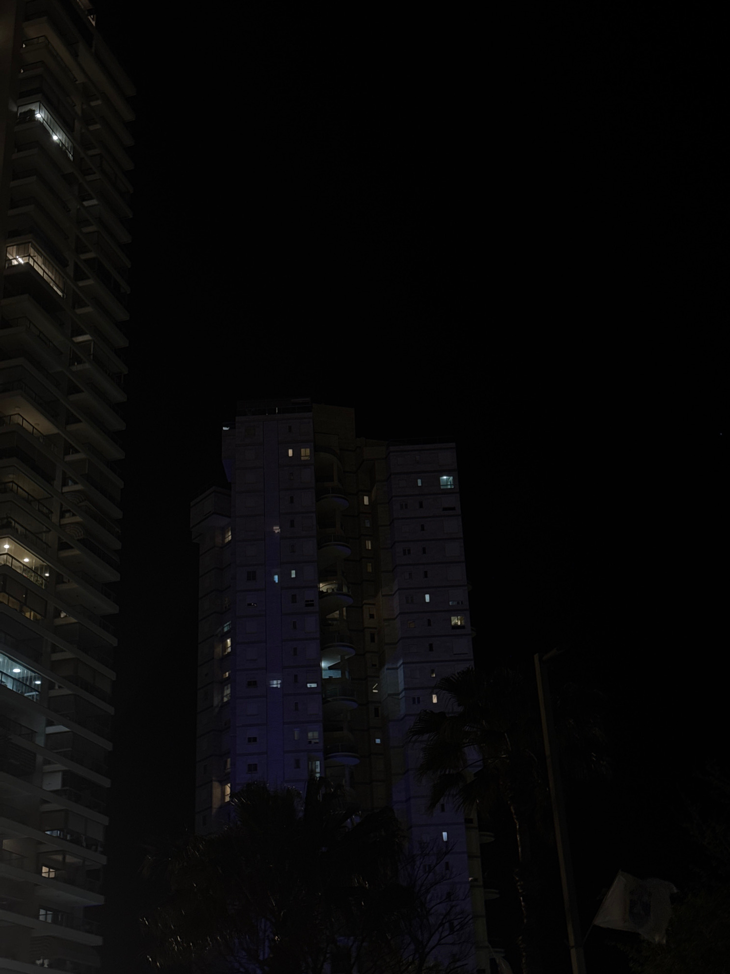 The image captures a night scene in Bat Yam, Israel, featuring two prominent buildings. The first building, situated lower in the frame, exhibits a repetitive pattern of protruding, slatted structures…read more