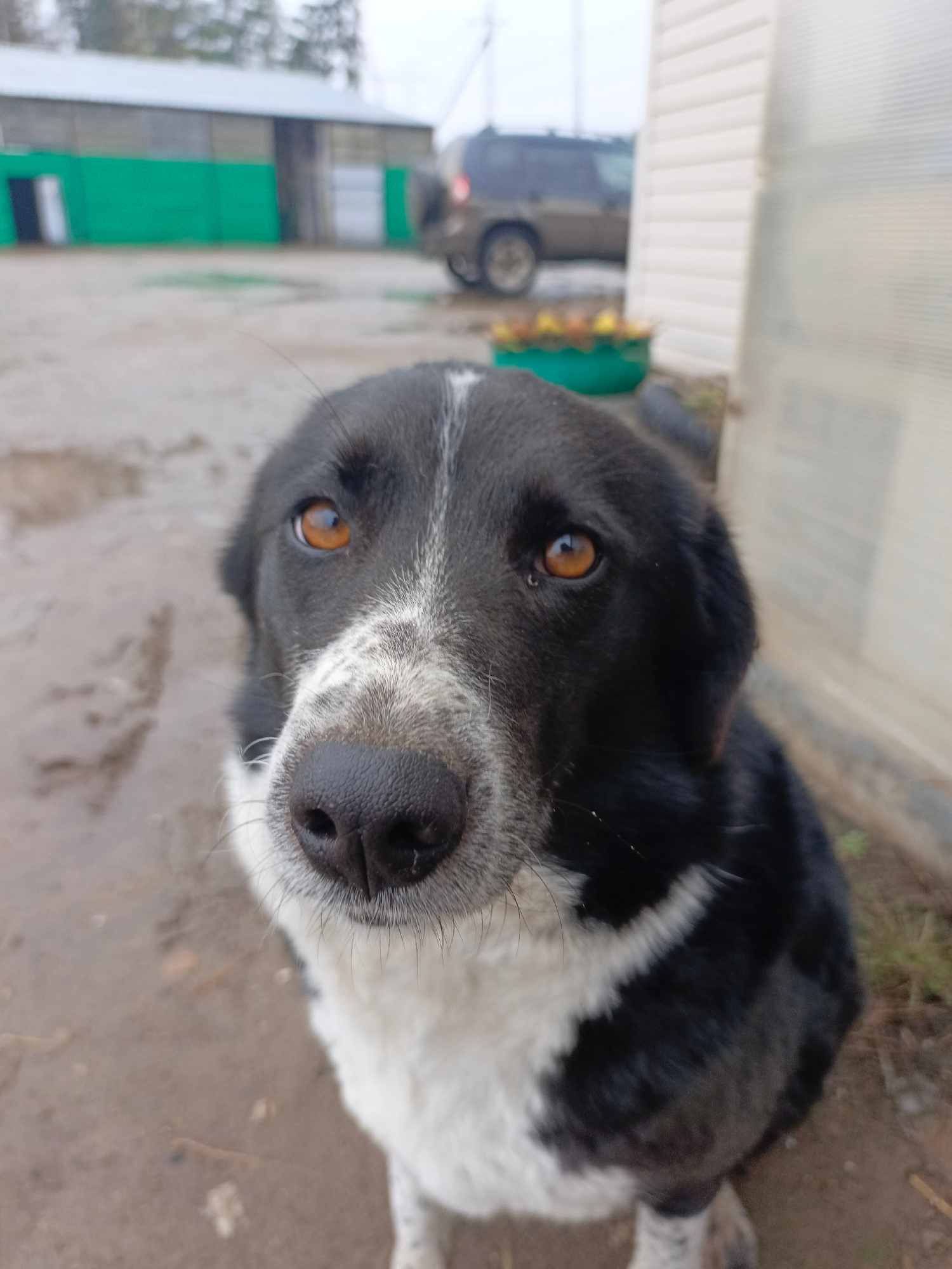 A close-up, high-angle shot captures a black and white dog with amber eyes. The dog's wet nose is prominent. The background shows a muddy ground. In the blurred background, there is a green-painted bu…read more