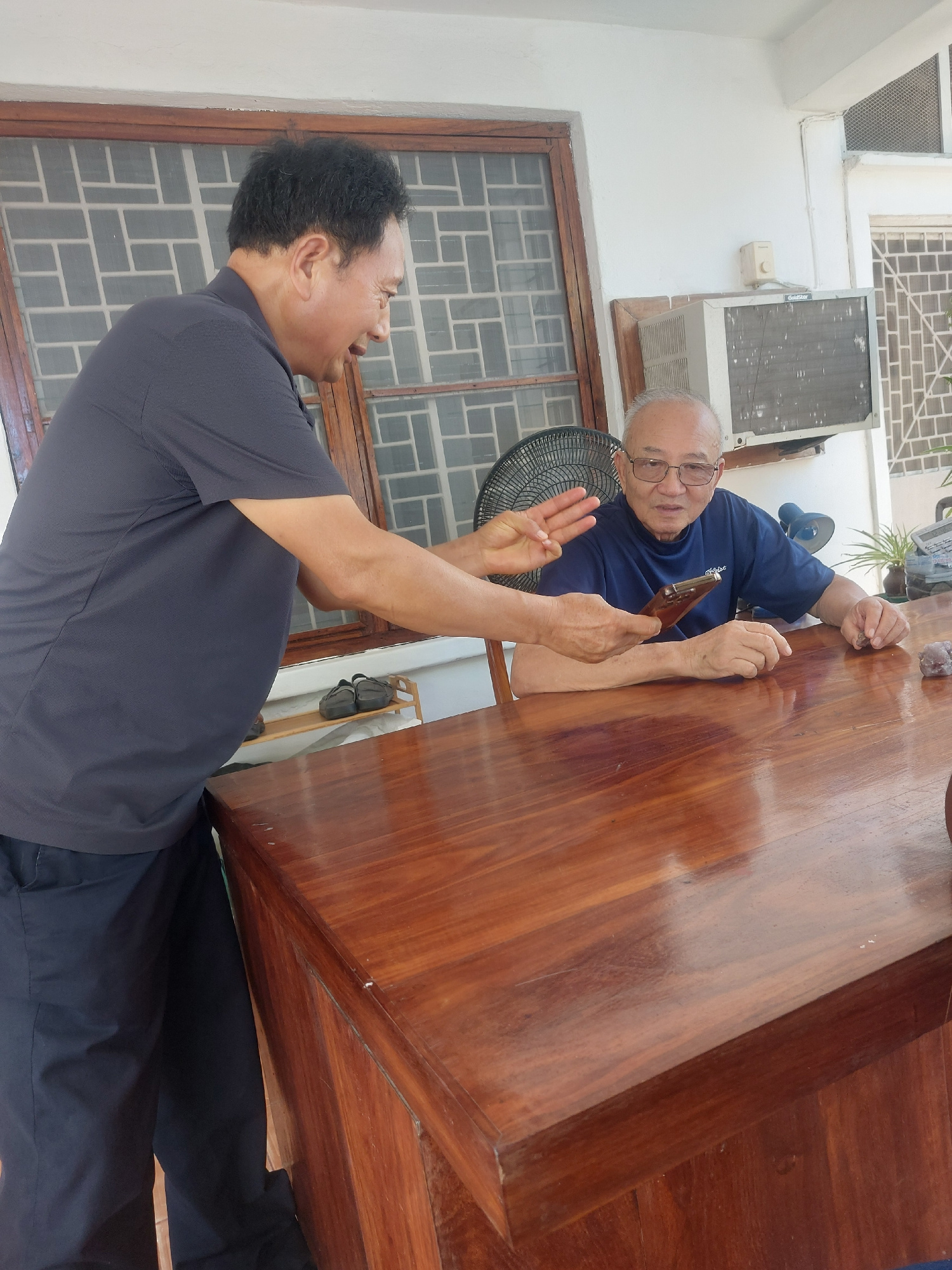 The image captures two adult men engaged in an animated conversation in what appears to be a casual indoor or semi-outdoor setting. The scene is brightly lit, suggesting it is daytime. One man, older…read more