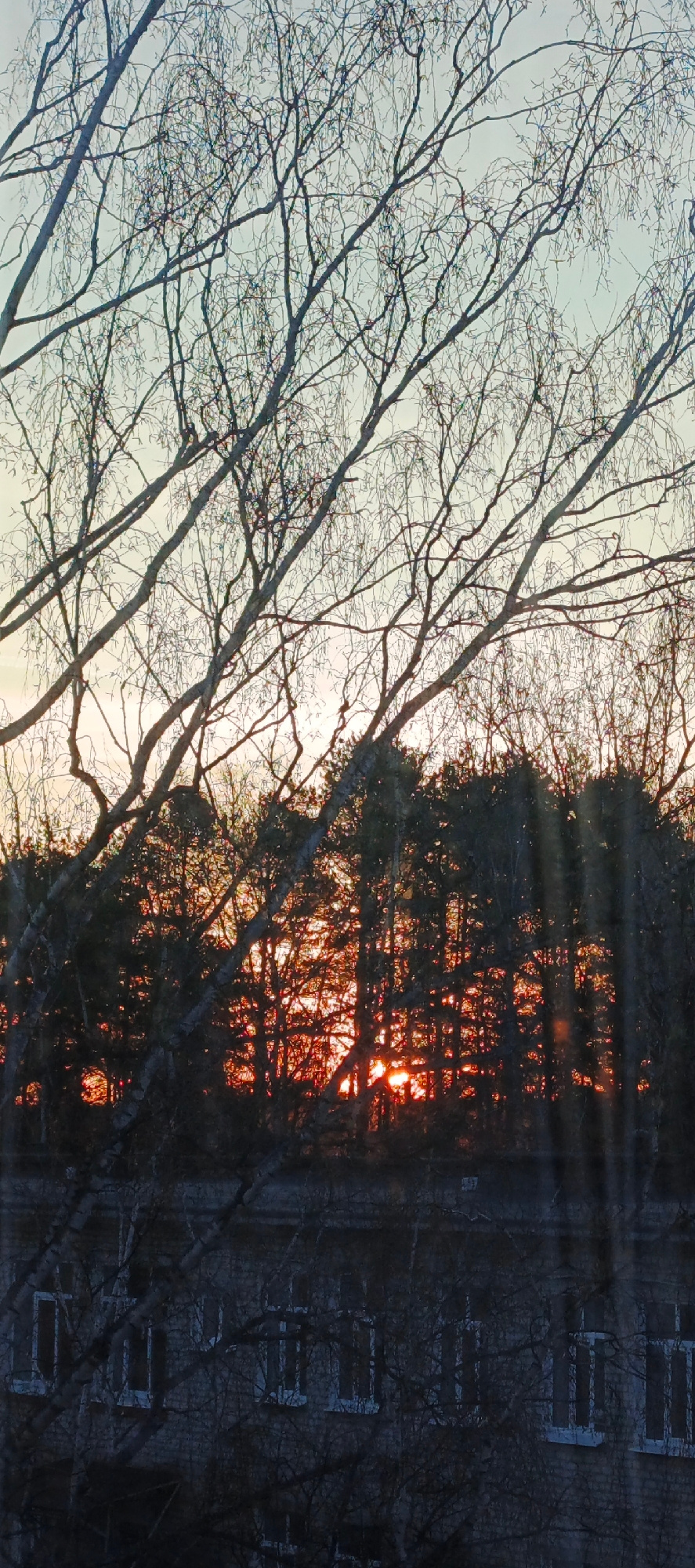This image captures an atmospheric sunset viewed through a network of bare tree branches, likely from a window in Chaikovsky, Russia. The scene is layered, starting with prominent, intricate branches…read more