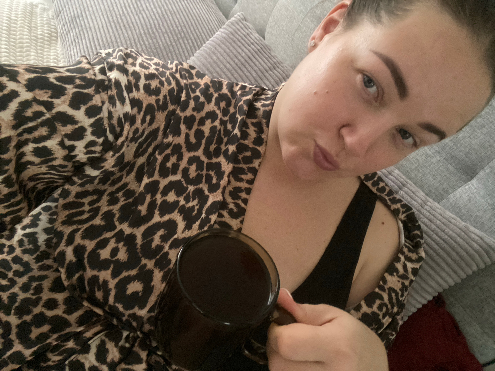 The image shows a woman lying on a gray corduroy-textured surface, possibly a couch or bed. She is wearing a leopard-print top over what appears to be a black bra or tank top. She holds a black mug fi…read more