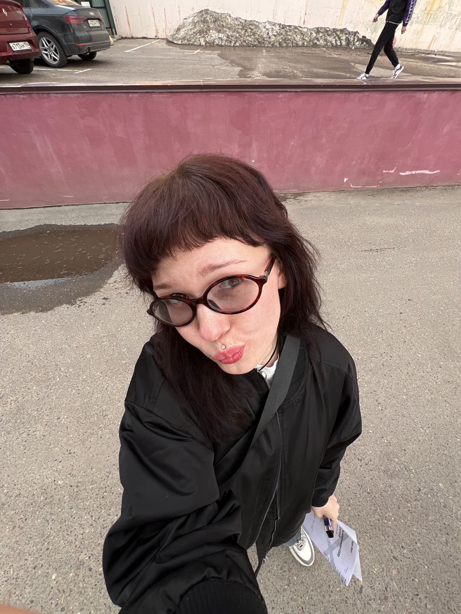 A woman is standing outside in what appears to be a city environment. The background includes a red brick wall, a paved area with a puddle, and glimpses of parked cars and buildings. She is wearing gl…read more