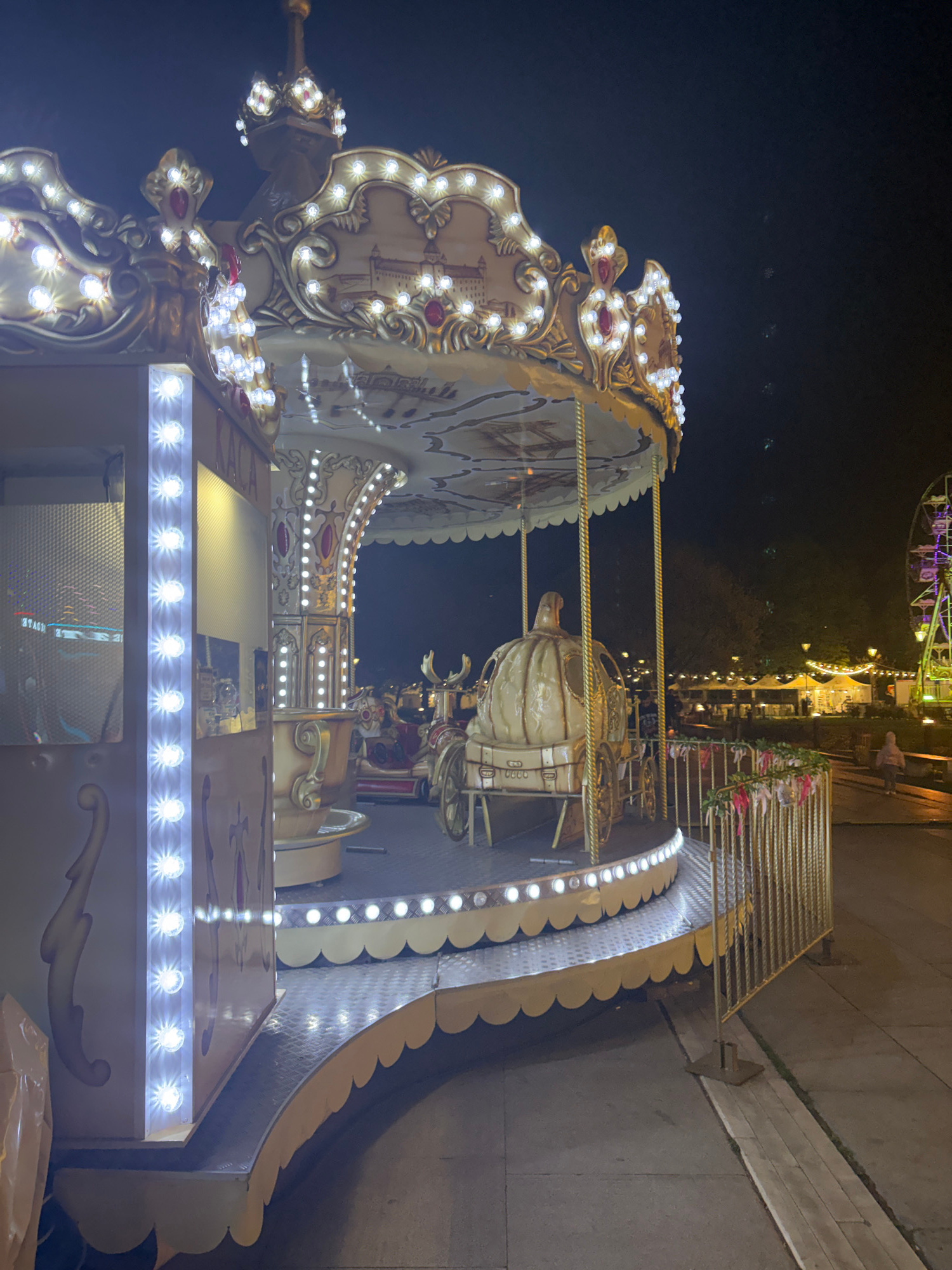 The image captures a brightly lit carousel at an amusement park or carnival at night. The main subject is the ornate carousel, which is lavishly decorated with white and gold accents and illuminated b…read more