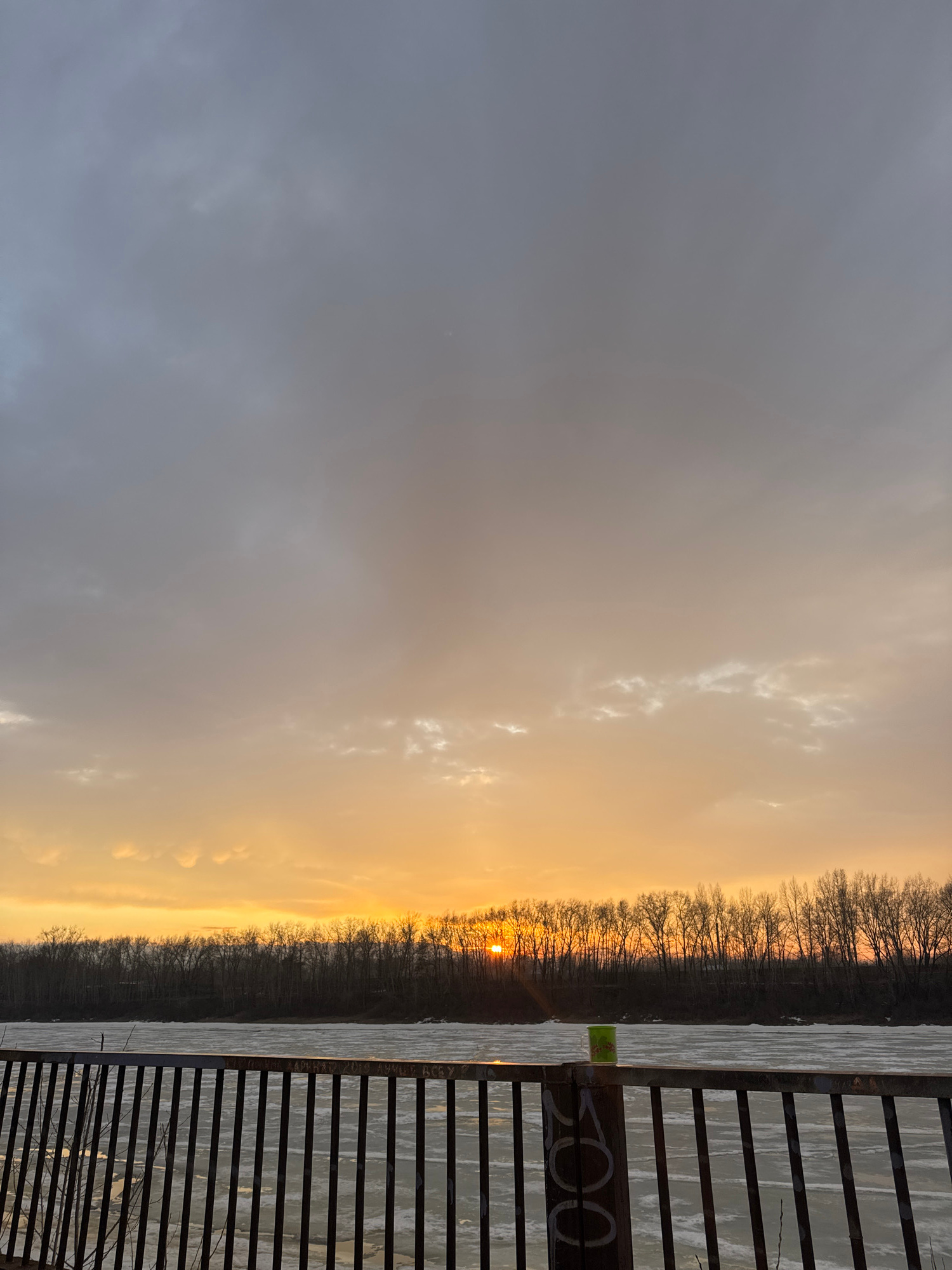 The image shows a sunset over the Kama River in Chaikovsky, Russia. The view is from a pier or walkway with a metal railing. The sky is a gradient of gray to orange as the sun sets behind a treeline o…read more