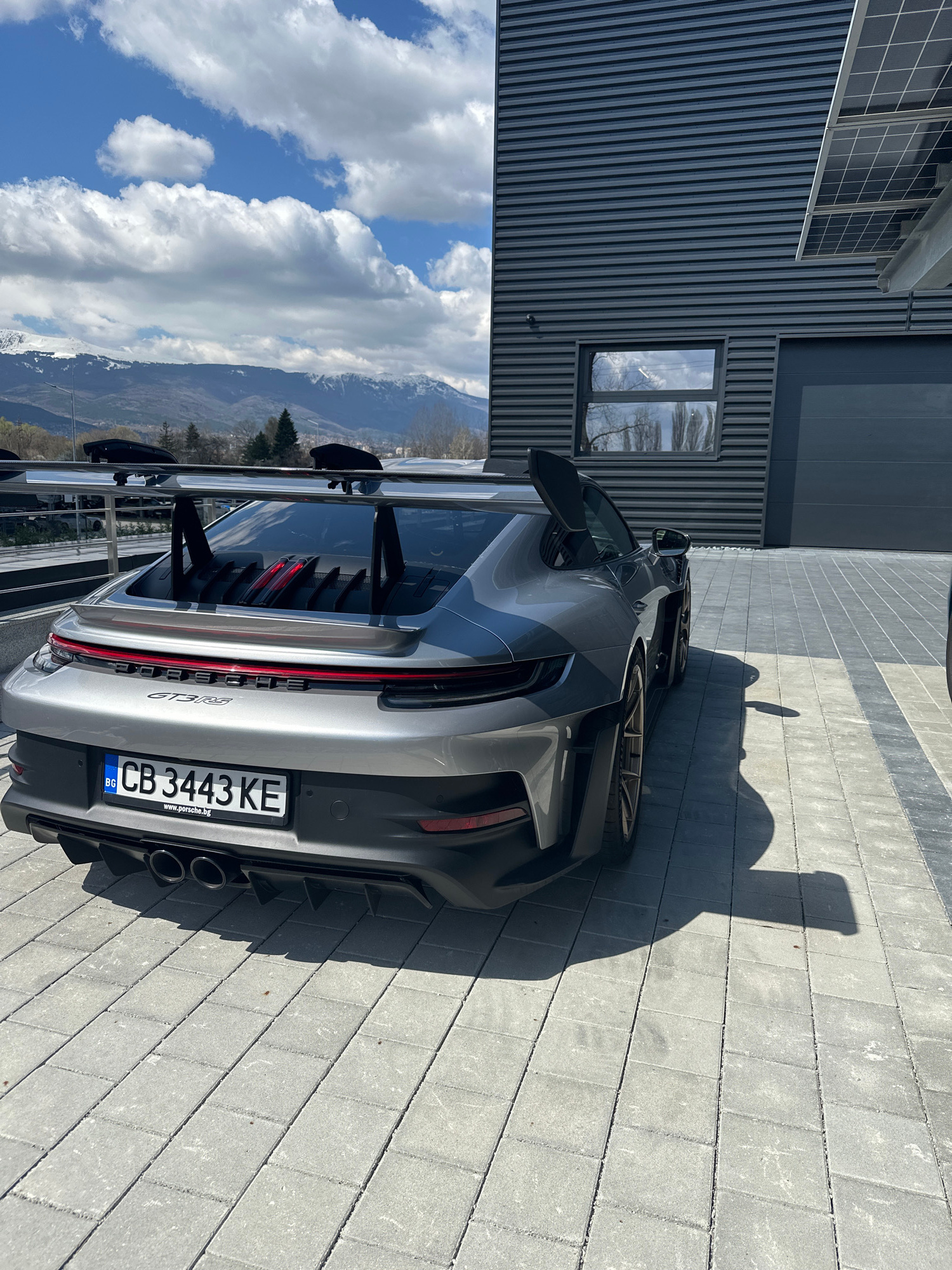 The image shows the rear of a silver Porsche GT3 RS parked on a paved surface in what appears to be a modern, upscale area. The car has a Bulgarian license plate that reads "CB 3443 KE". The license p…read more